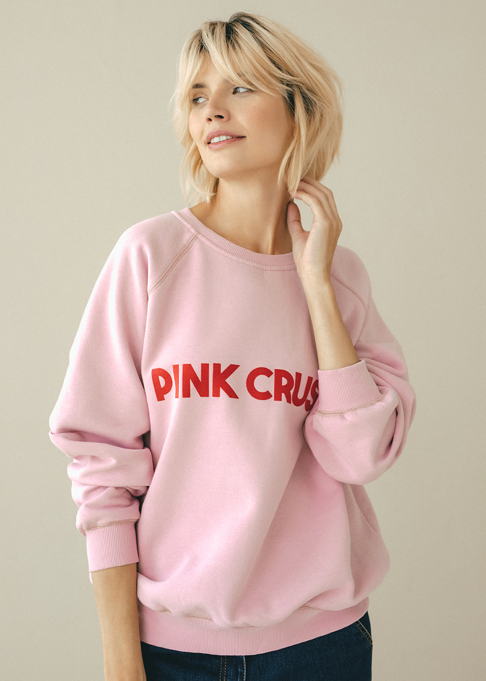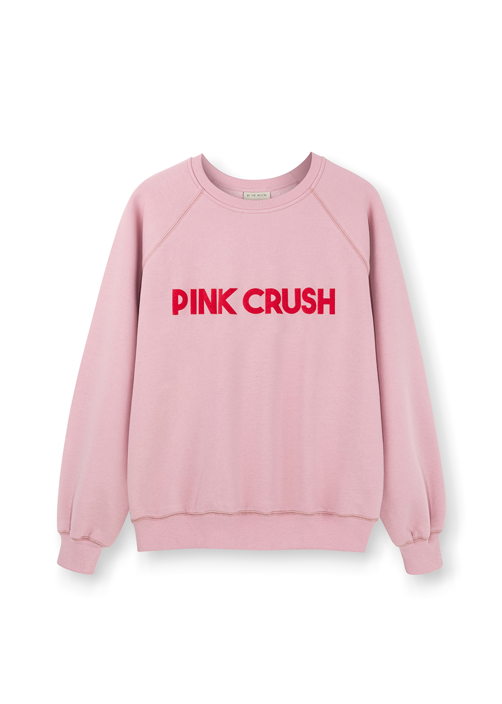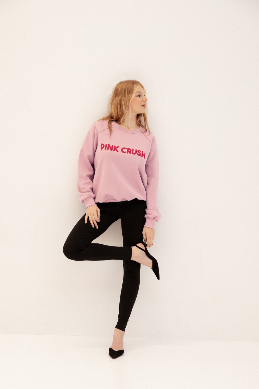 Klasyczna bluza damska w pastelowym odcieniu różu, z napisem PINK CRUSH na przodzie. Napis wykonany jest flockiem, z delikatnym meszkiem, w kolorze czerwonym. Ma luźny krój, raglanowe rękawy, zakończona jest ściągaczem. Uszyta z miękkiej, drapanej dzianiny. Ciepła i bardzo miła w dotyku. Bluza dla miłośniczek różu. Możesz uzupełnić różowy look kupując także różową koszulkę PINK CRUSH – w odcieniu bardziej mocnego, intensywnego różu.