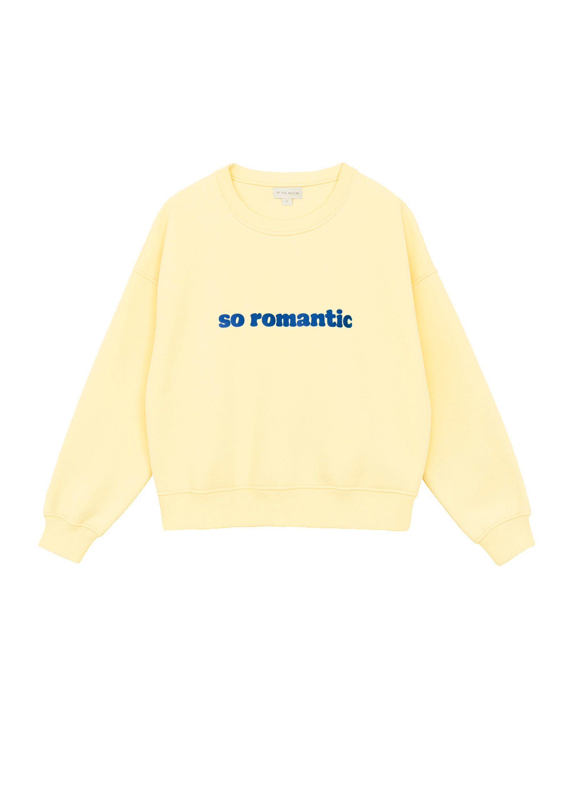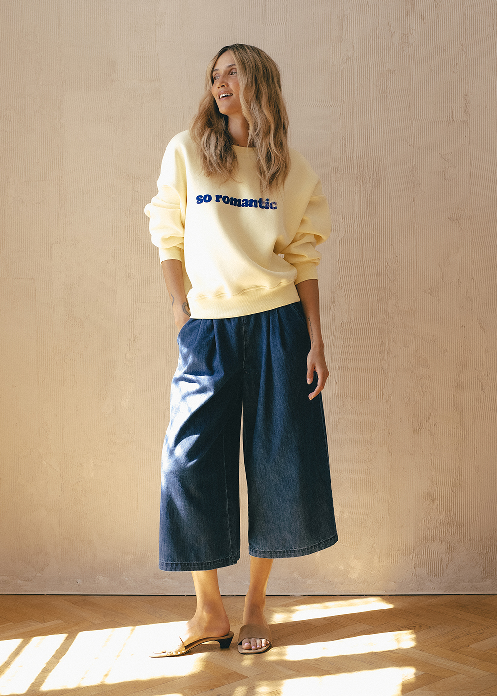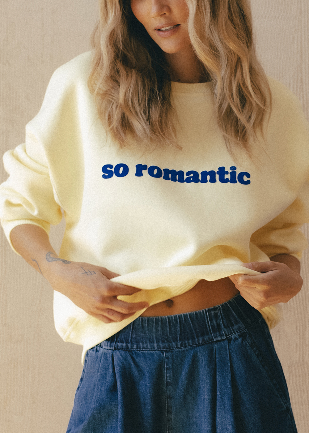 Our bestselling So Romantic sweatshirt in light blue has a new look! This time in the season’s trendiest color – creamy butter, with a contrasting print. This sweatshirt offers comfort with a romantic twist. This short, loose-fit sweatshirt will wrap you in comfort while the trending buttery colour will light up your skin. The “so romantic” message is made in the flock technique – soft to the touch, bold in contrast, sweet in spirit. Wear it with jeans, skirts, or throw it effortlessly over a dress. Take it with you on holiday or wear it on a date in the city. The sweatshirt is made of soft, OEKO-TEX-certified jersey fabric with a brushed interior.