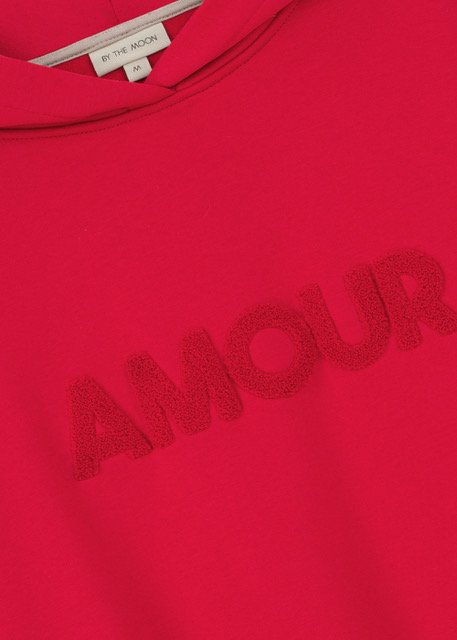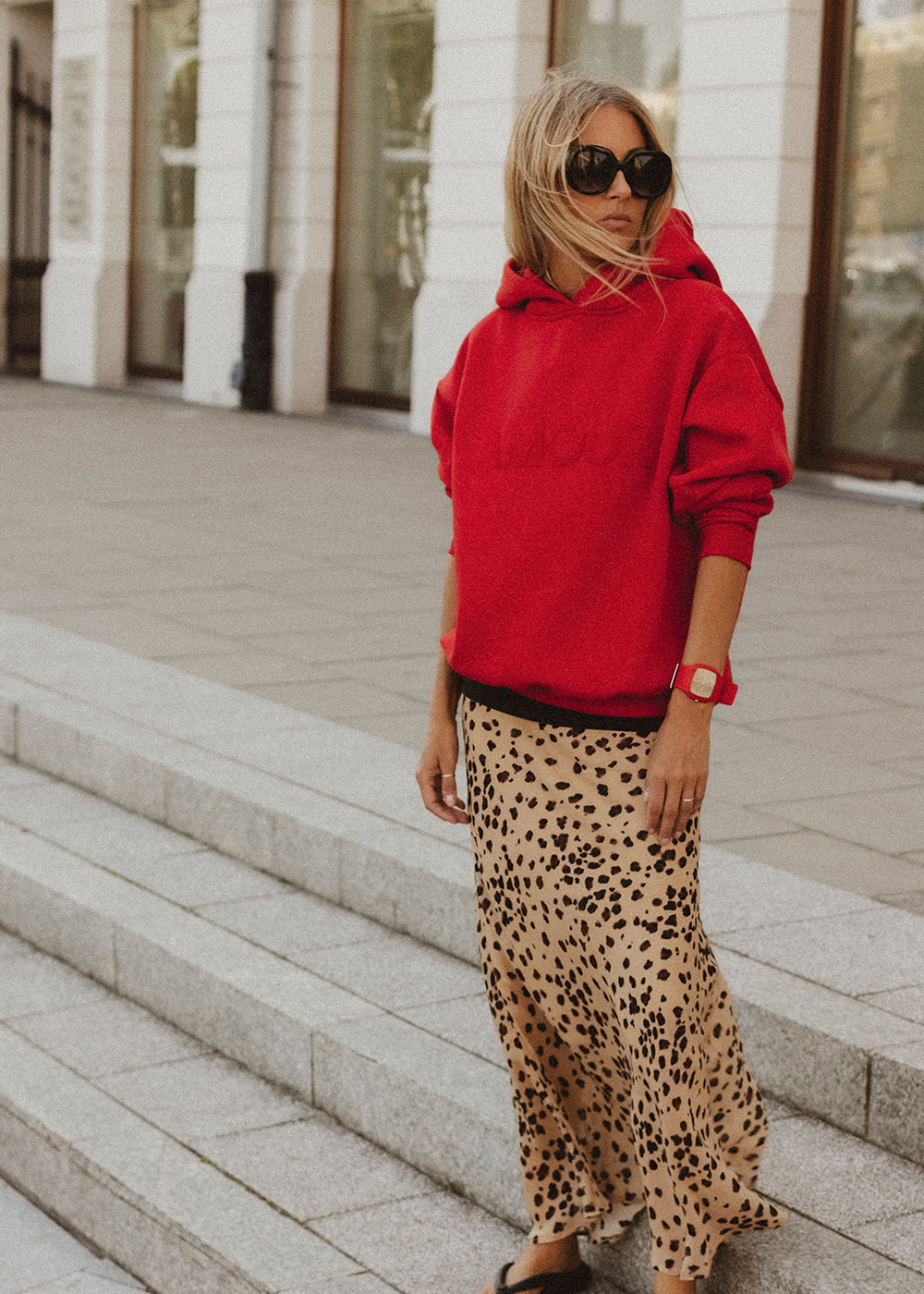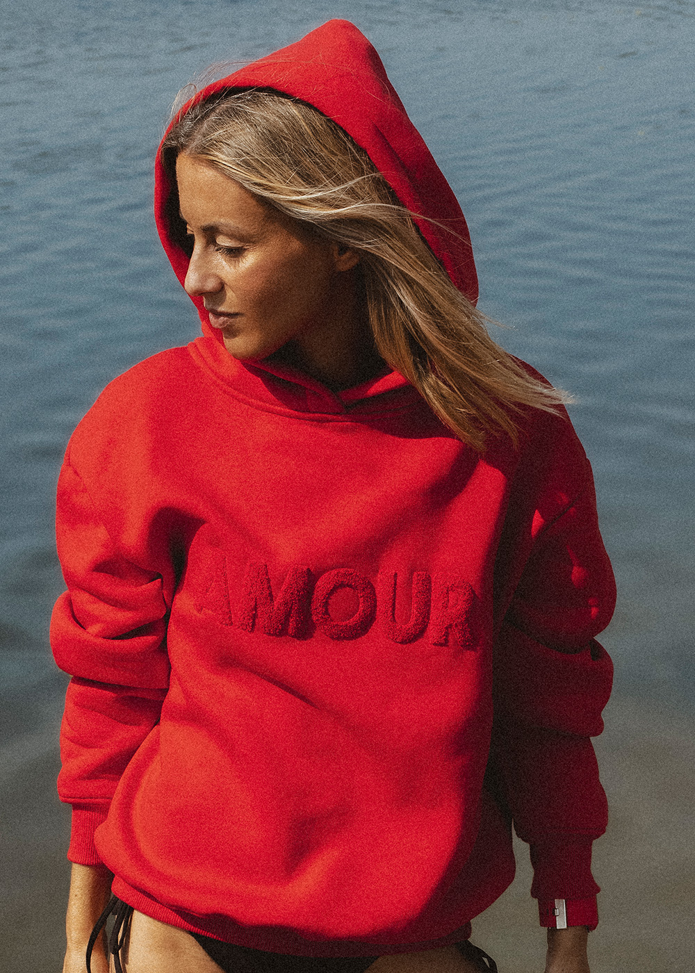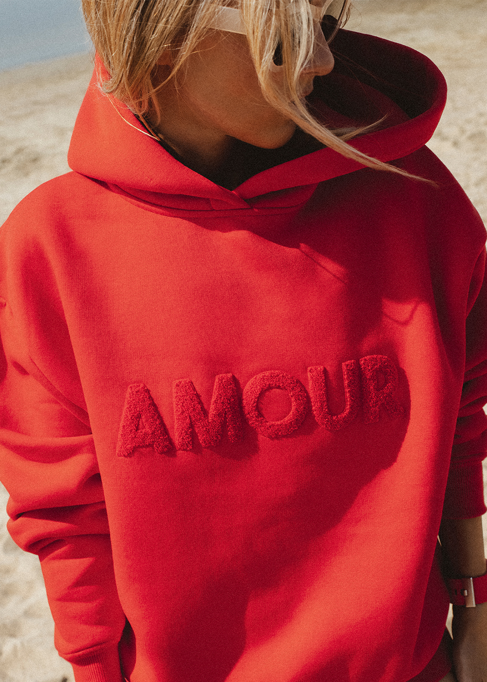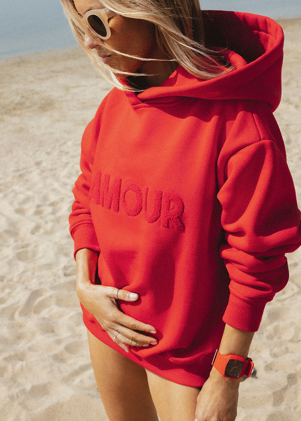 Piękna, soczyście czerwona bluza damska z dużym kapturem. Na przodzie, wyhaftowany techniką chenille, napis AMOUR. Bluza jest luźna, z opuszczonymi delikatnie rękawami. Ciepła i otulająca. Rozgrzeje i doda koloru Waszym jesiennym stylizacjom. Połącz ją z ciemnymi jeansami lub naszą super modną panterkową spódnicą Leopard. Uszyta z grubej, ale niezwykle miękkiej w dotyku dzianiny drapanej, z meszkiem wewnątrz.