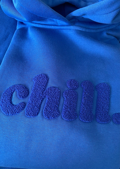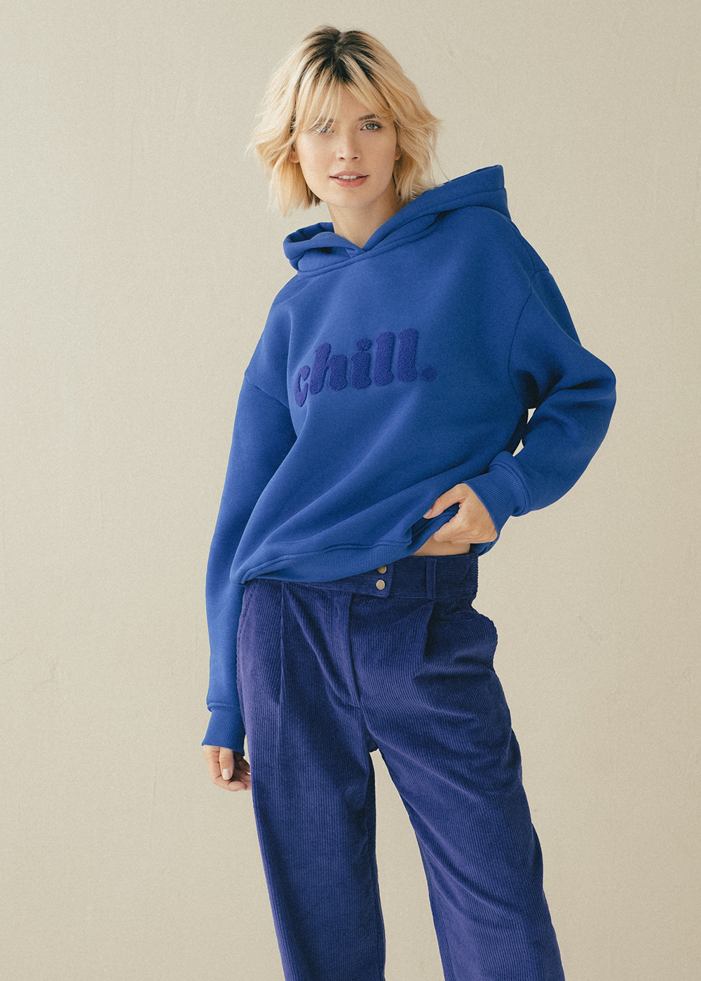 Monochromatyczna, damska bluza z kapturem. Na przodzie wyhaftowany napis Chill. Luźny krój, z opuszczonymi rękawami i ciepłym, obszernym kapturem. W szlachetnym, bardzo modnym w nadchodzącym sezonie, kolorze royal blue. Do chillowania w plenerze i w miejskich klimatach. Można ją nosić zarówno do spódnic jak i do dresowych spodni. Uszyta z grubej, ale niezwykle miękkiej w dotyku dzianiny drapanej, z meszkiem wewnątrz.