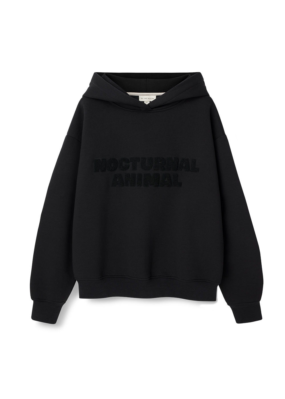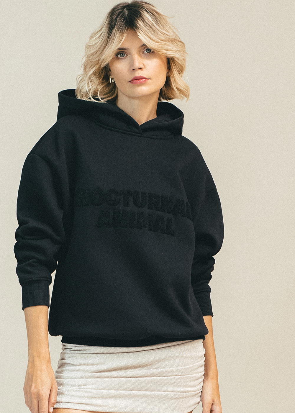 Czarna bluza z kapturem dla tych z Was, które nie lubią spać, kochają nocne spacery i życie po zmroku. Z przodu wyhaftowany jest napis Nocturnal Animal czyli nocne zwierzę. Uszyta z grubej, ale niezwykle miękkiej w dotyku, dzianiny drapanej, z meszkiem wewnątrz. Sprawdzi się nie tylko w sportowej wersji. Wygląda świetnie w lekko rockowej stylizacji do dużych botków, kowbojek i panterkowych legginsów.