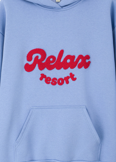 Super ciepła, wygodna bluza damska z obszernym kapturem i kieszenią na przodzie. Model tzw. “kangurka”. Z wyhaftowanym metodą chenille napisem Relax resort. Bluza jest lekko oversize’owa, z opuszczonymi rękawami, o długości za pupę. Uszyta z grubej, ale niezwykle miękkiej w dotyku dzianiny drapanej, z meszkiem wewnątrz. W spokojnym odcieniu błękitu, otulająca i relaksująca. Dostępna jest w dwóch wersjach – z czerwonym i błękitnym haftem (sprawdź też bluzę blue Relax resort).