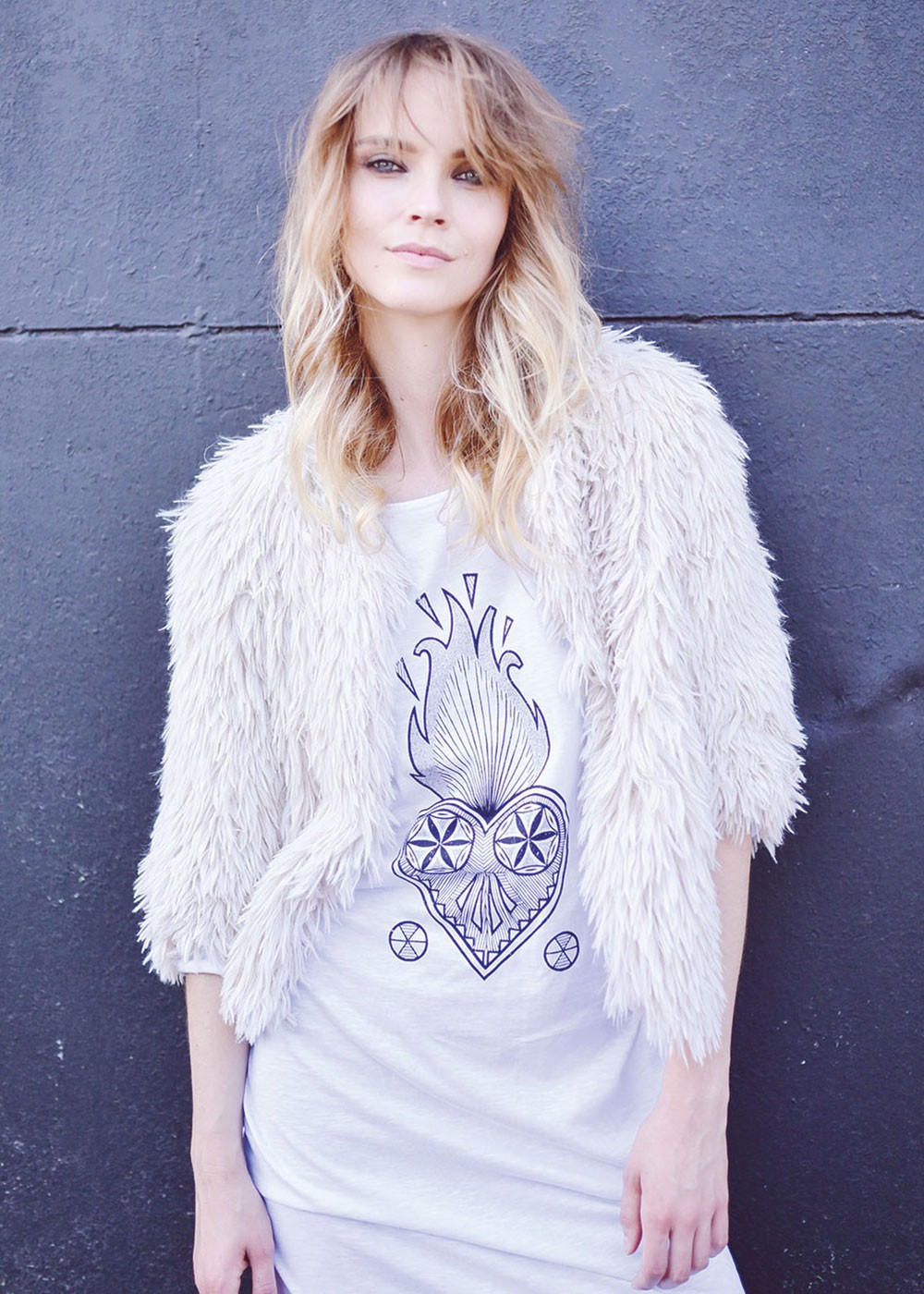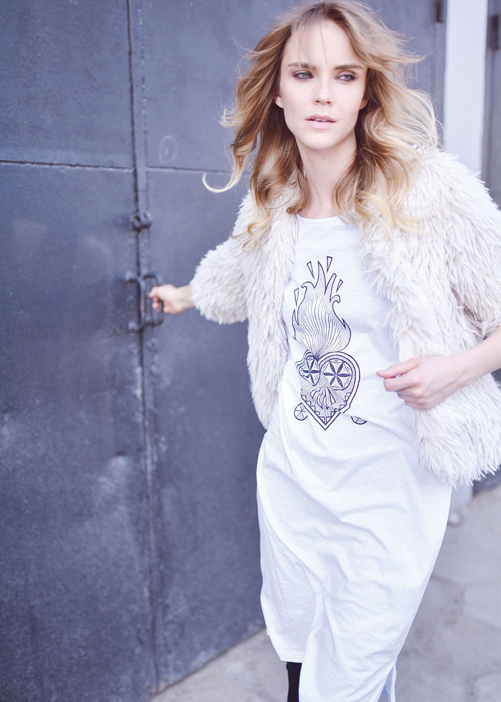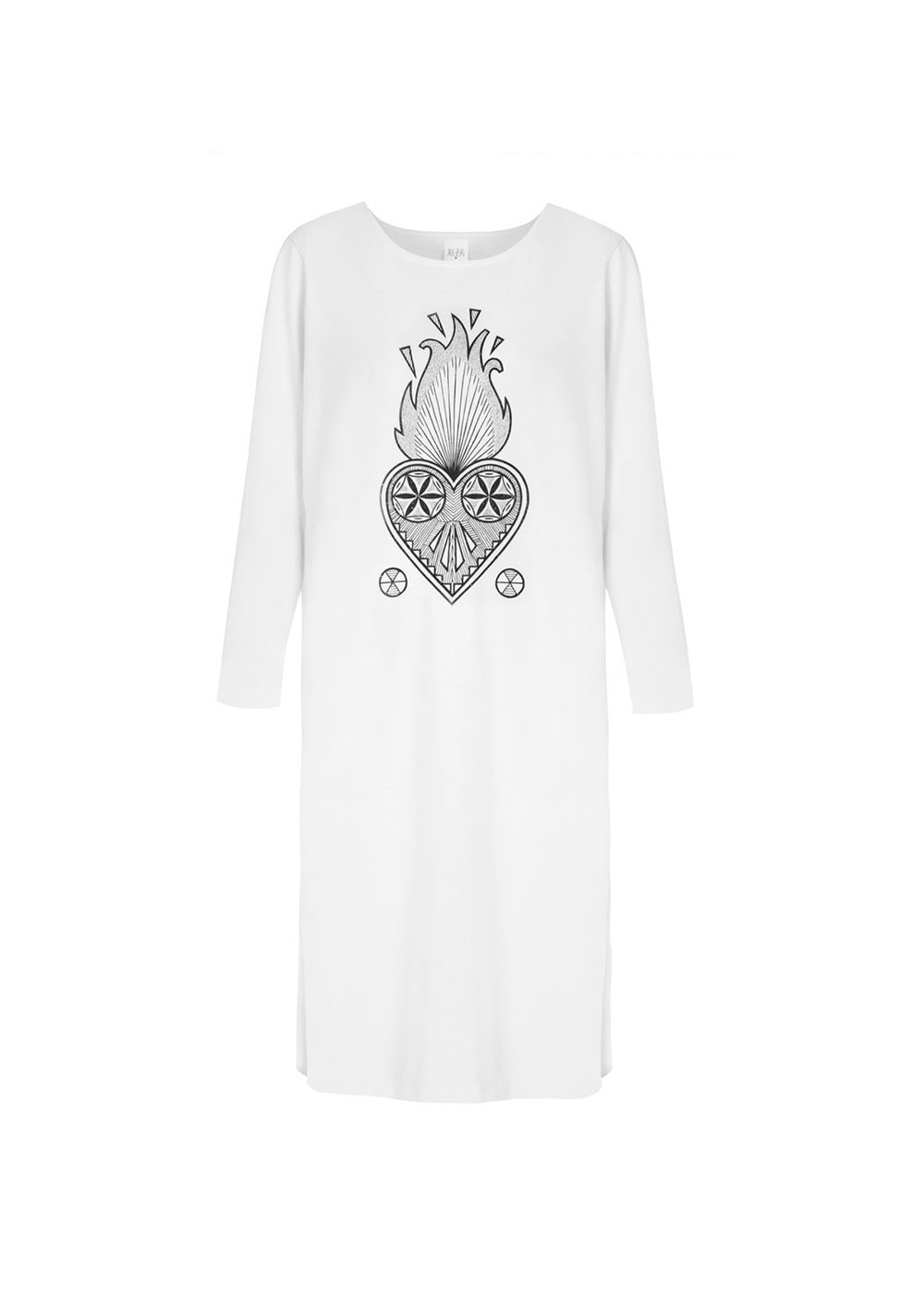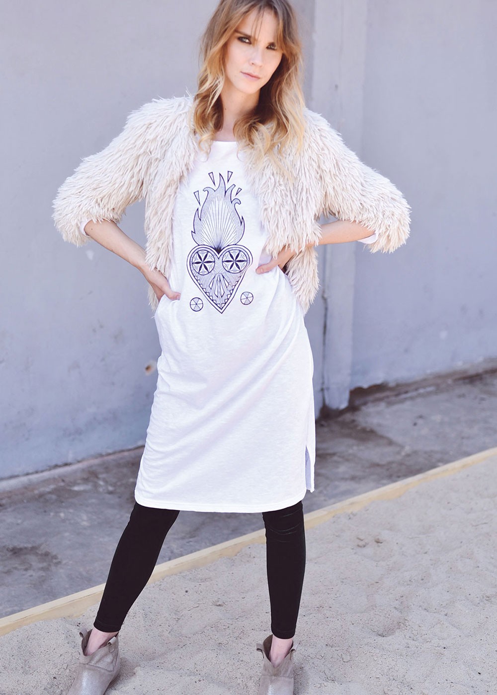 Biała, damska t-shirtowa sukienka, z miękkiej bawełnianej dzianiny. Oryginalny nadruk autorstwa Zuzy Miśko. Ilustracja inspirowana stylem Zakopiańskim. Z boku rozcięcia, długość w okolice kolan. Można nosić także z paskiem.