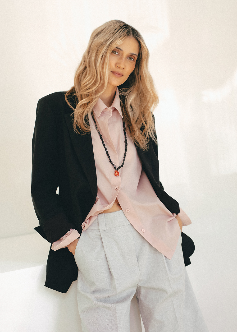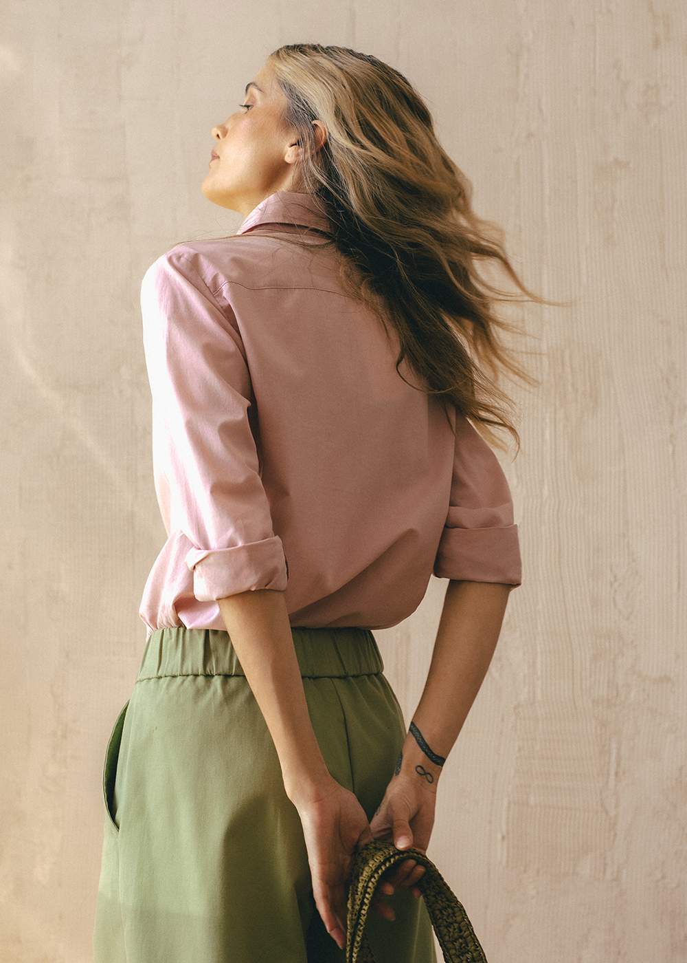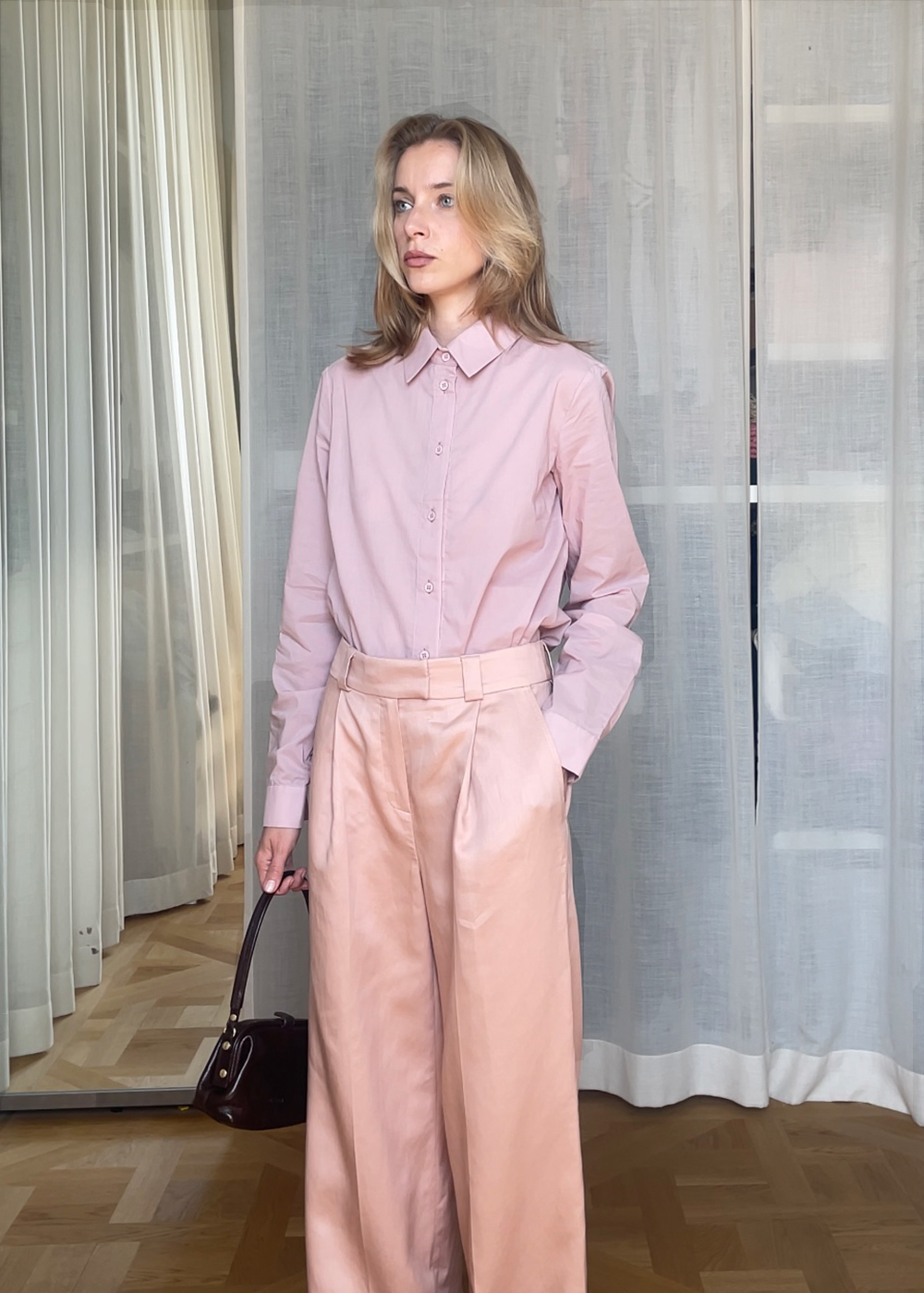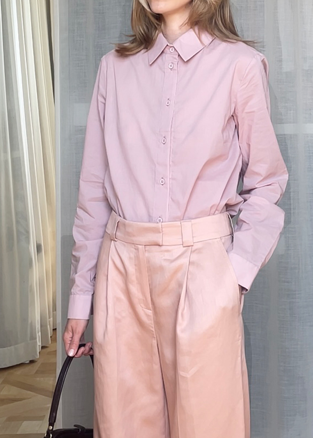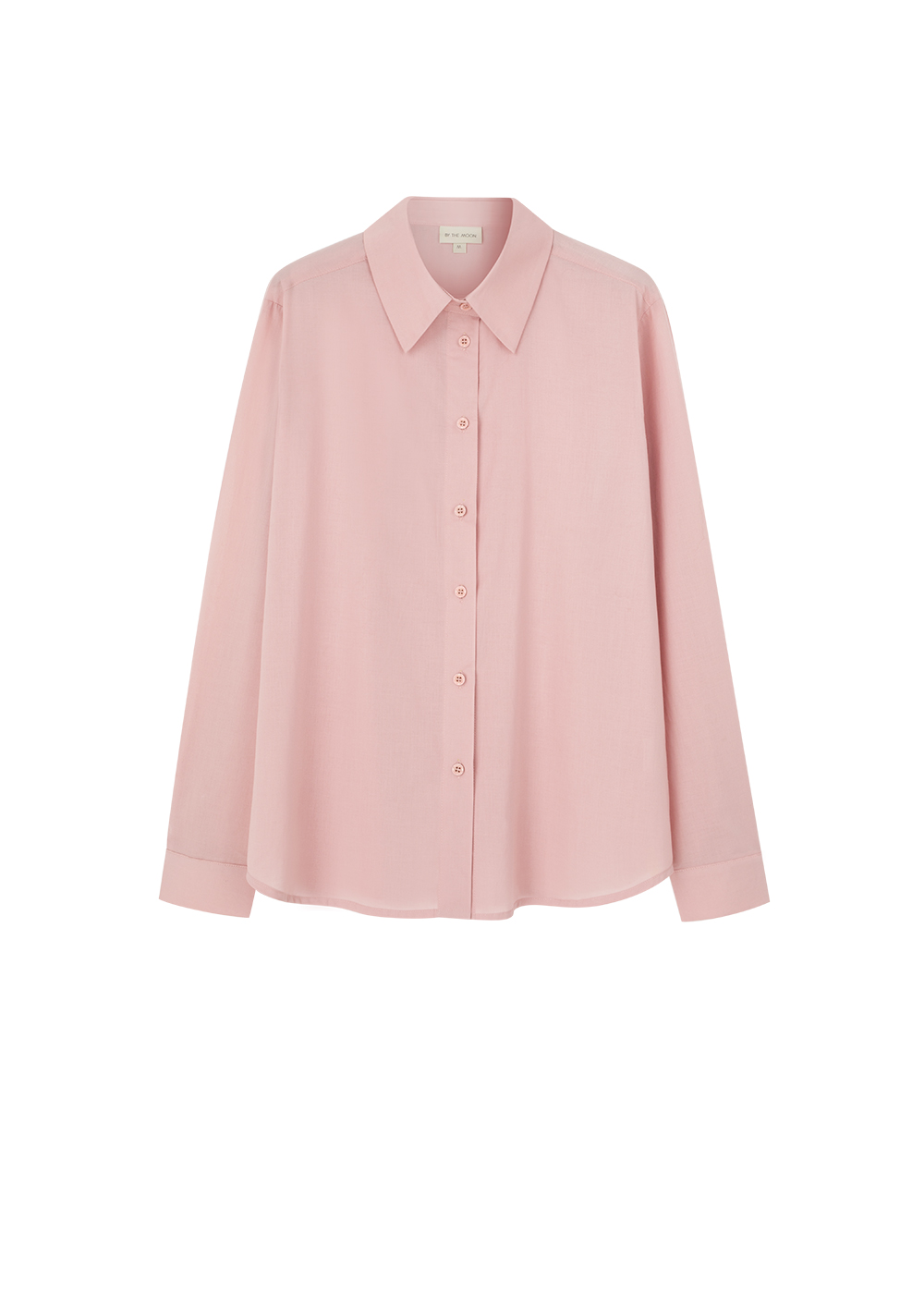 A delicate pastel pink shirt with a classic cut – light, airy, and ultra-feminine. The collar and cuffed sleeves make it perfect for everyday wear or more stylish looks. Pair it with jeans or our wide-leg Charlie trousers. Roll up the sleeves for an effortless, relaxed vibe. Ideal for summer. A great base for jewellery, a blazer, or a skirt.