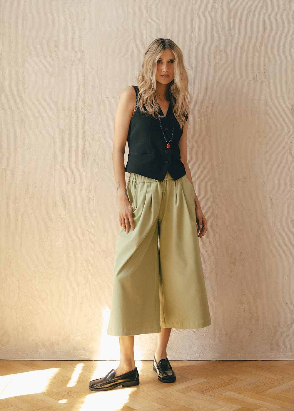 Aya Sage culottes are your new everyday staple – comfy, stylish, and in the most flattering sage green. They’re cut from soft peach-finish fabric that feels soft on the skin. The relaxed fit, wide legs, and elastic waist make them effortless to wear from morning to night. The versatile color and shape work with everything – from tonal neutrals to bold contrasts or classic black. Pair with flip-flops, sneakers, or boots, depending on the vibe.