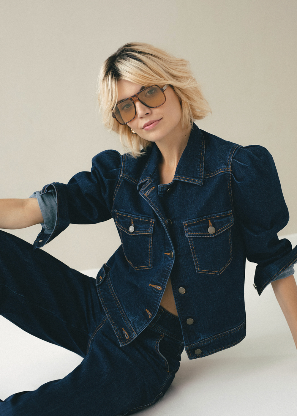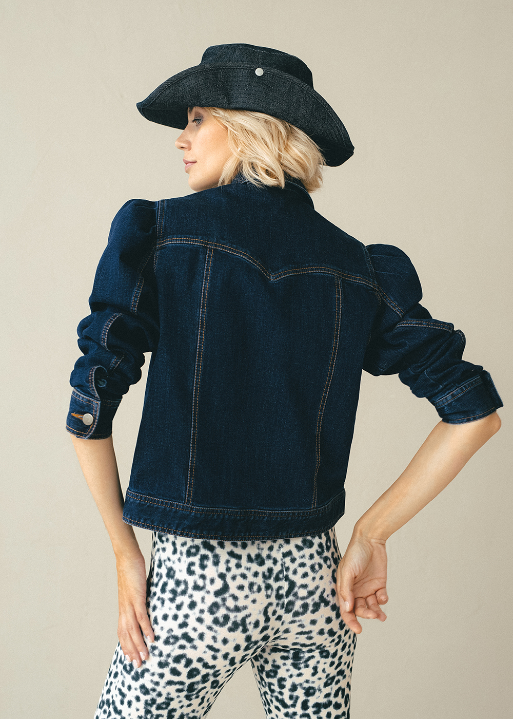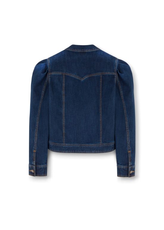 Krótka kurtka jeansowa o wyrazistym, westernowym charakterze, z mocnymi przeszyciami. Wykonana z ciemnego, lekko elastycznego denimu. Charakterystyczne bufki podkreślają ramiona i nadają kobiecego, mocnego charakteru. Kształt karczka nawiązuje do estetyki Dzikiego Zachodu, nadając całości super modnego wyglądu. Zapięcie na guziki oraz przednie kieszenie podkreślają klasyczny styl, a regulowany dół pozwala na delikatne dopasowanie kurtki. Kurtka Ivy tworzy doskonałą bazę do stylizacji – zarówno w połączeniu z naszymi denimowymi spodniami, jak i kobiecymi spódnicami. Must-have jesiennego sezonu.