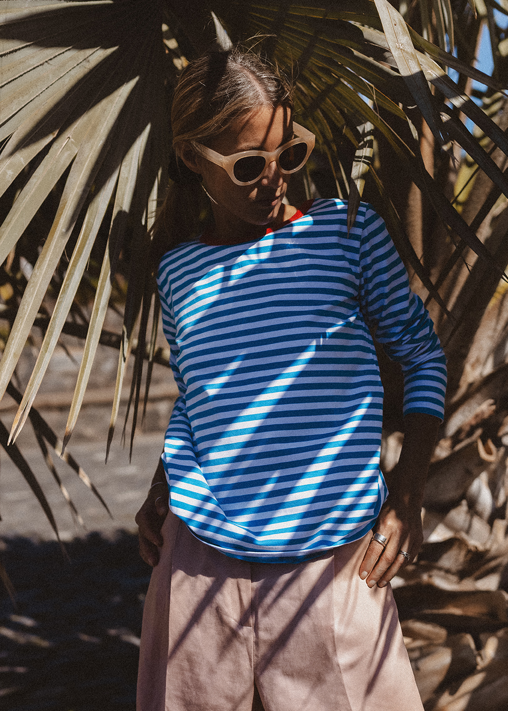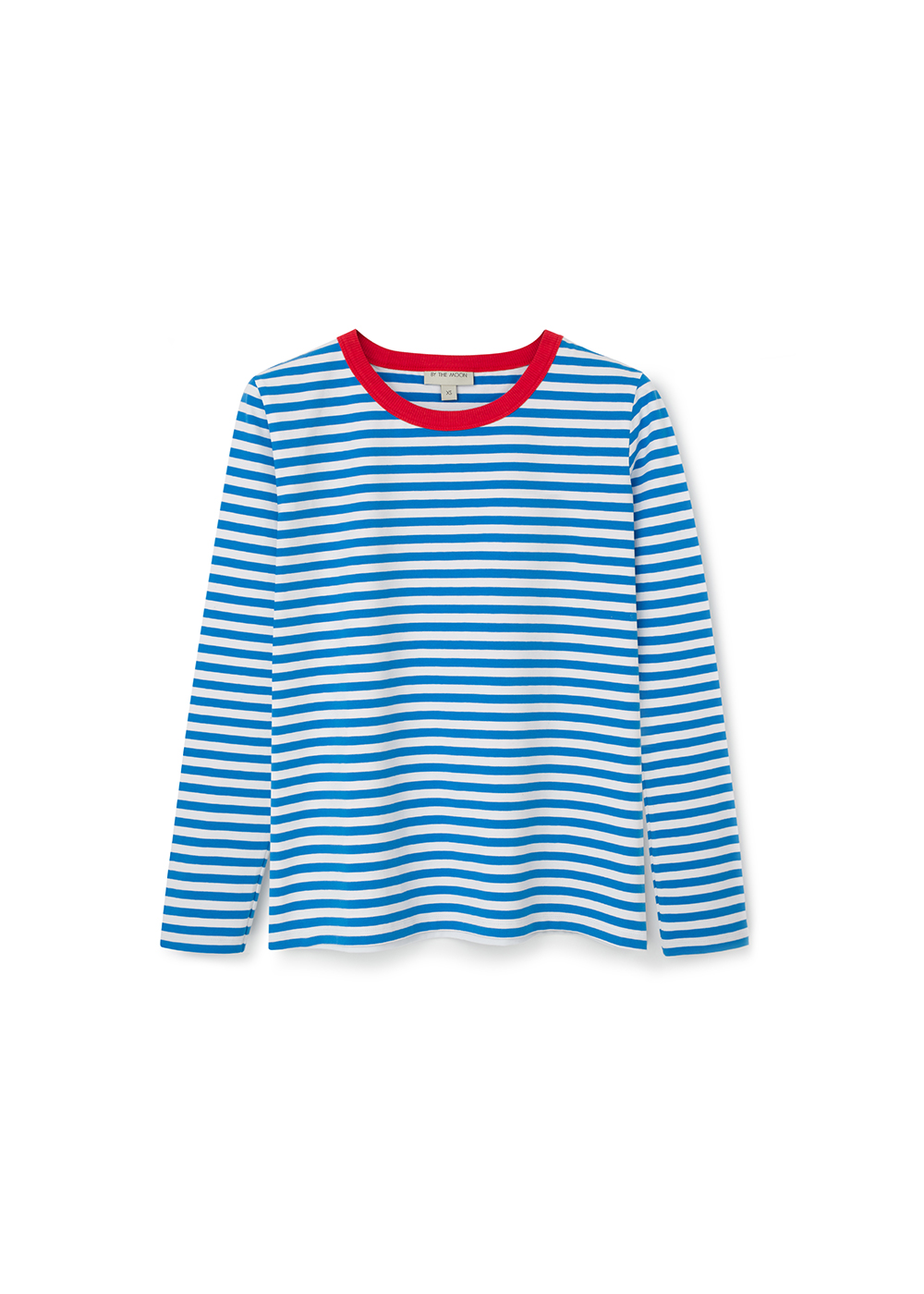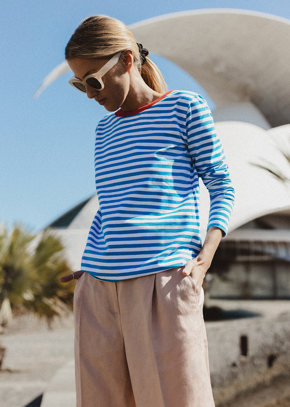 A timeless classic with a touch of French nonchalance. This blue-and-white striped long-sleeve is the ideal mix of casual elegance and chic straight from France. The contrasting neckline in deep red adds character and a subtle retro vibe. Made from a soft, pleasant-to-the-touch cotton jersey, it gives you comfort all day long. Perfect with jeans, skirts, or a blazer – brings an effortless French style!