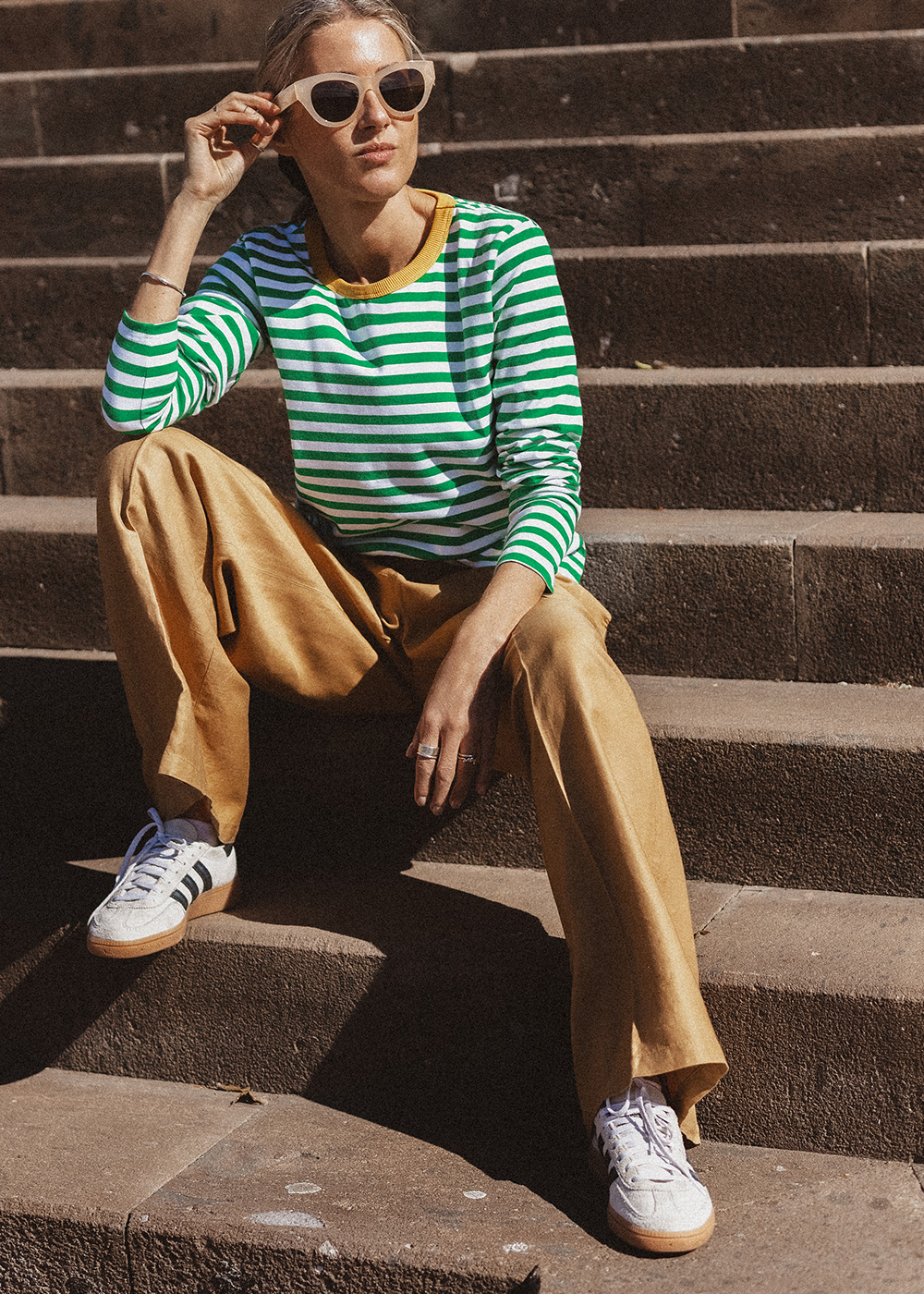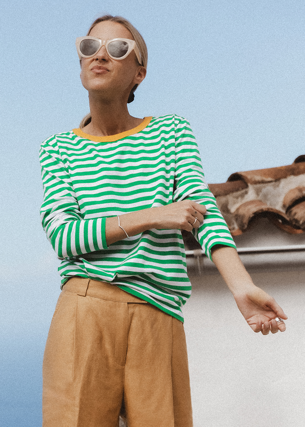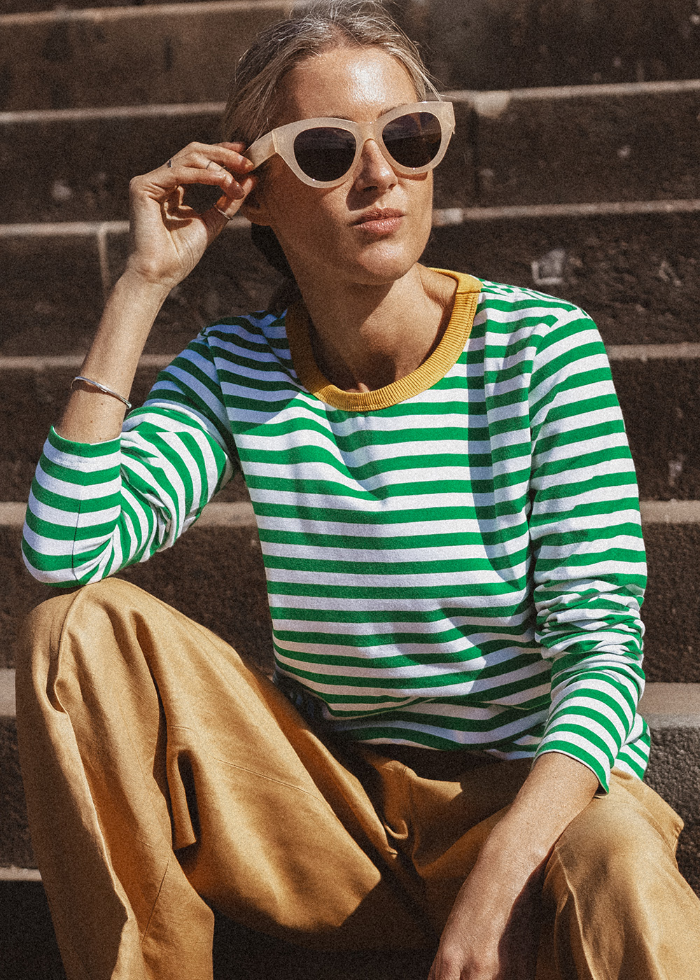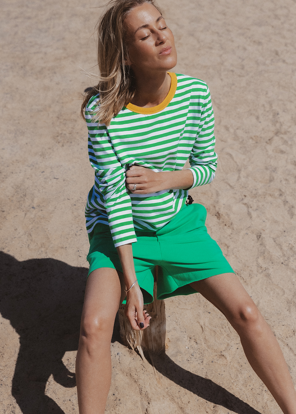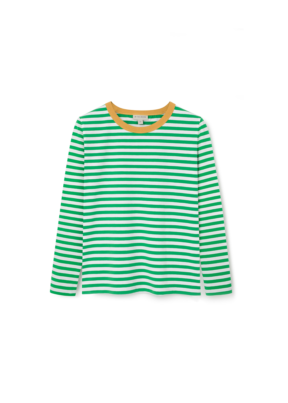 Longsleeve, that combines classic style with an energetic accent. Green and white stripes add freshness, and the contrasting neckline in a shade of sunny color gives the whole style a unique, energetic character. Made of soft, pleasant-to-the-touch cotton jersey. This model is perfect for both everyday styling and more expressive combinations. Wear it alone or as a base for your favorite sweaters and jackets.