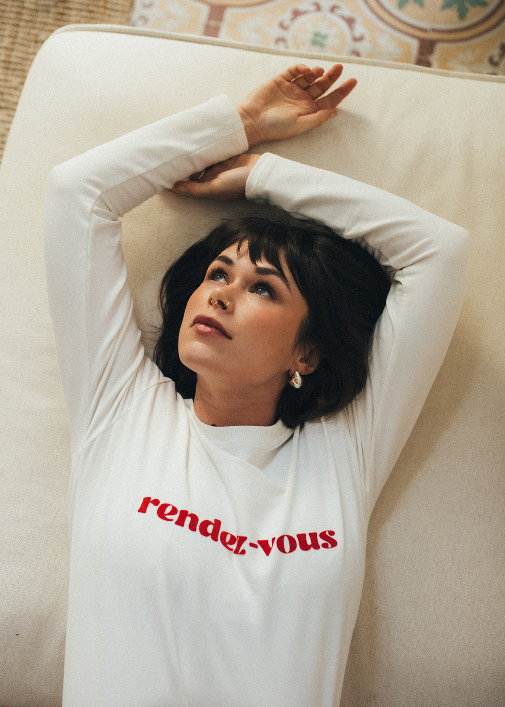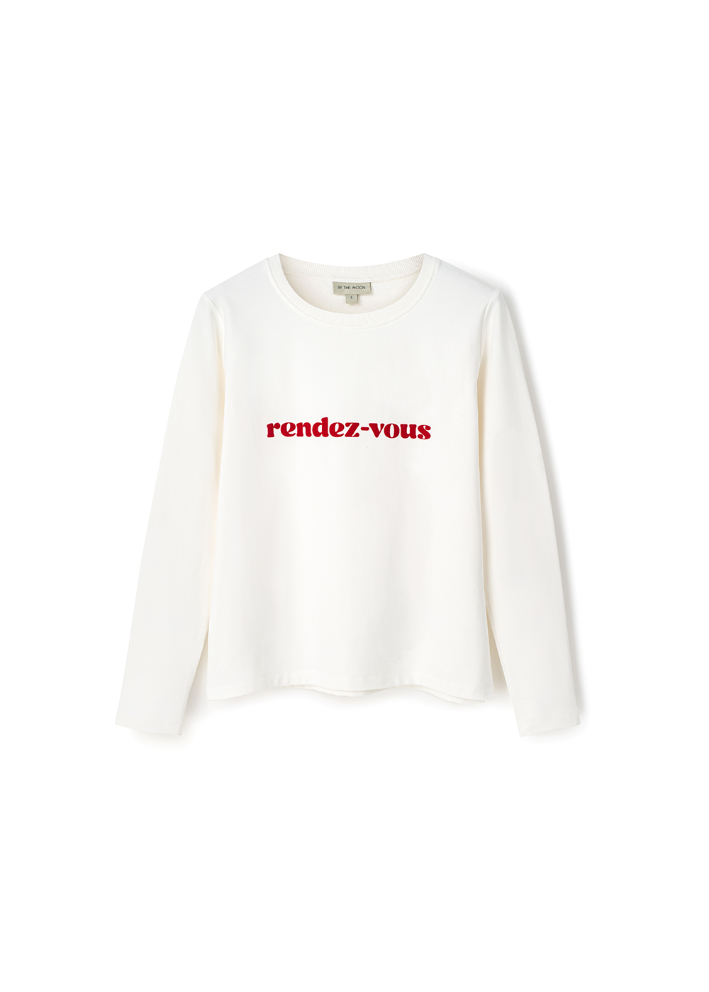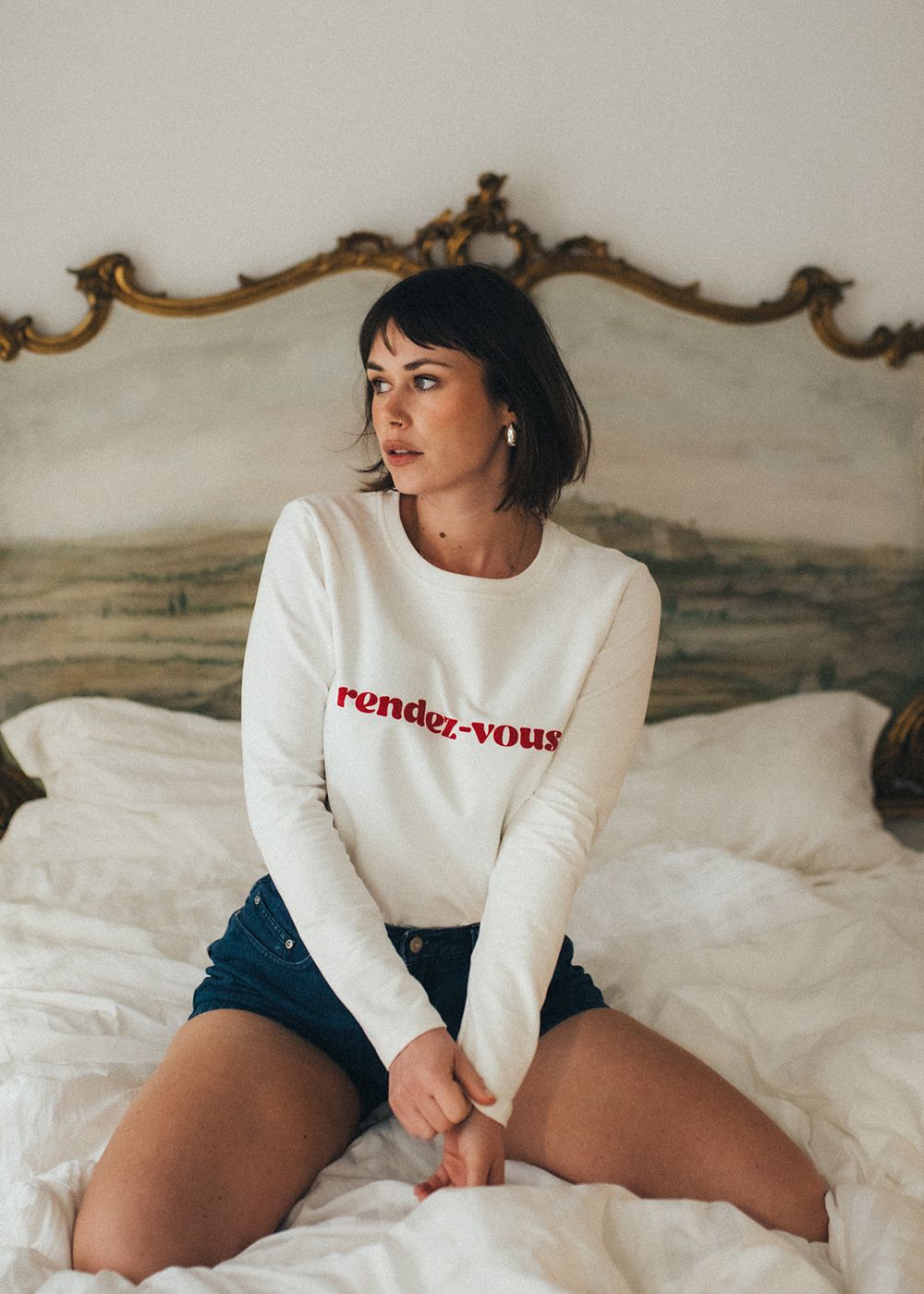 Klasyczny longsleeve damski uszyty z miękkiej, grubszej dzianiny z lekkim meszkiem od wewnątrz. Na przodzie napis rendez-vous wykonany flockiem, dodający romantycznego, paryskiego looku. Idealny na każdy dzień, nie tylko na randki i zalotne spotkania. Świetnie wygląda pod marynarką, w połączeniu z jeansami, czy szortami. Super modny top w stylu It Girl.
