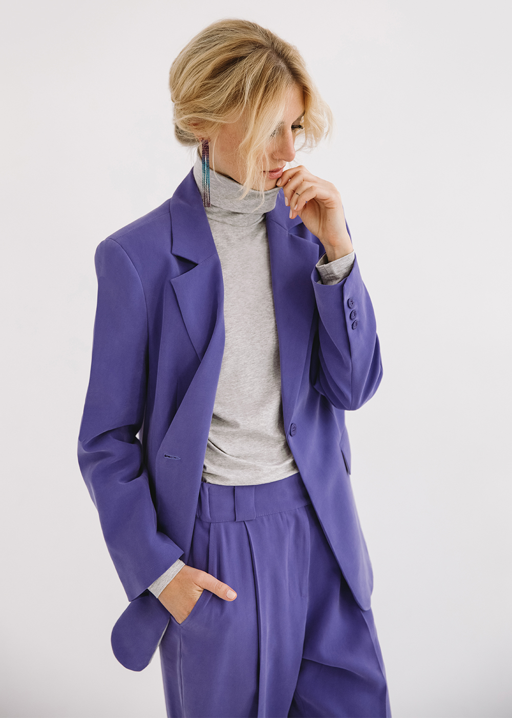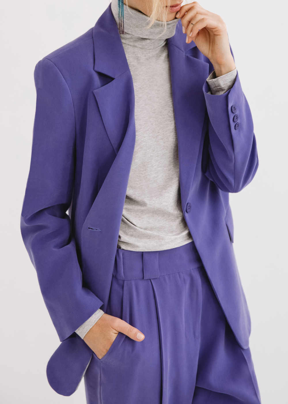 Marynarka to istotny element garderoby i kobiecej szafy. Ta, w najbardziej pożądanym kolorze sezonu, sprawi, że każda twoja stylizacja zwróci uwagę i przyciągnie wzrok;) Mocny, głęboki fiolet to must-have w sezonie jesienno-zimowym!