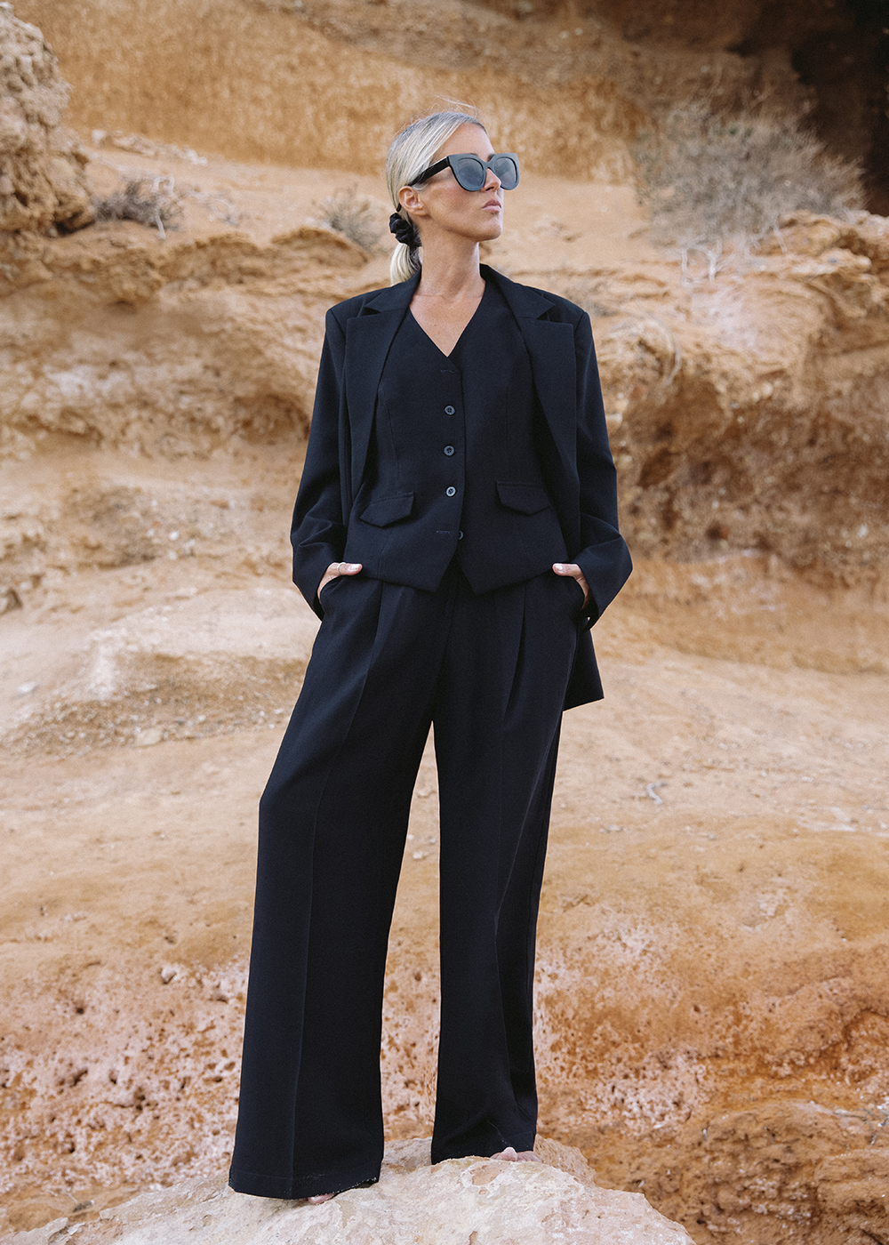 • czarne, damskie spodnie garniturowe, szerokie nogawki, luźne, eleganckie, modne, z wiskozy, do garnituru, czarna marynarka damska, polski produkt, made in poland