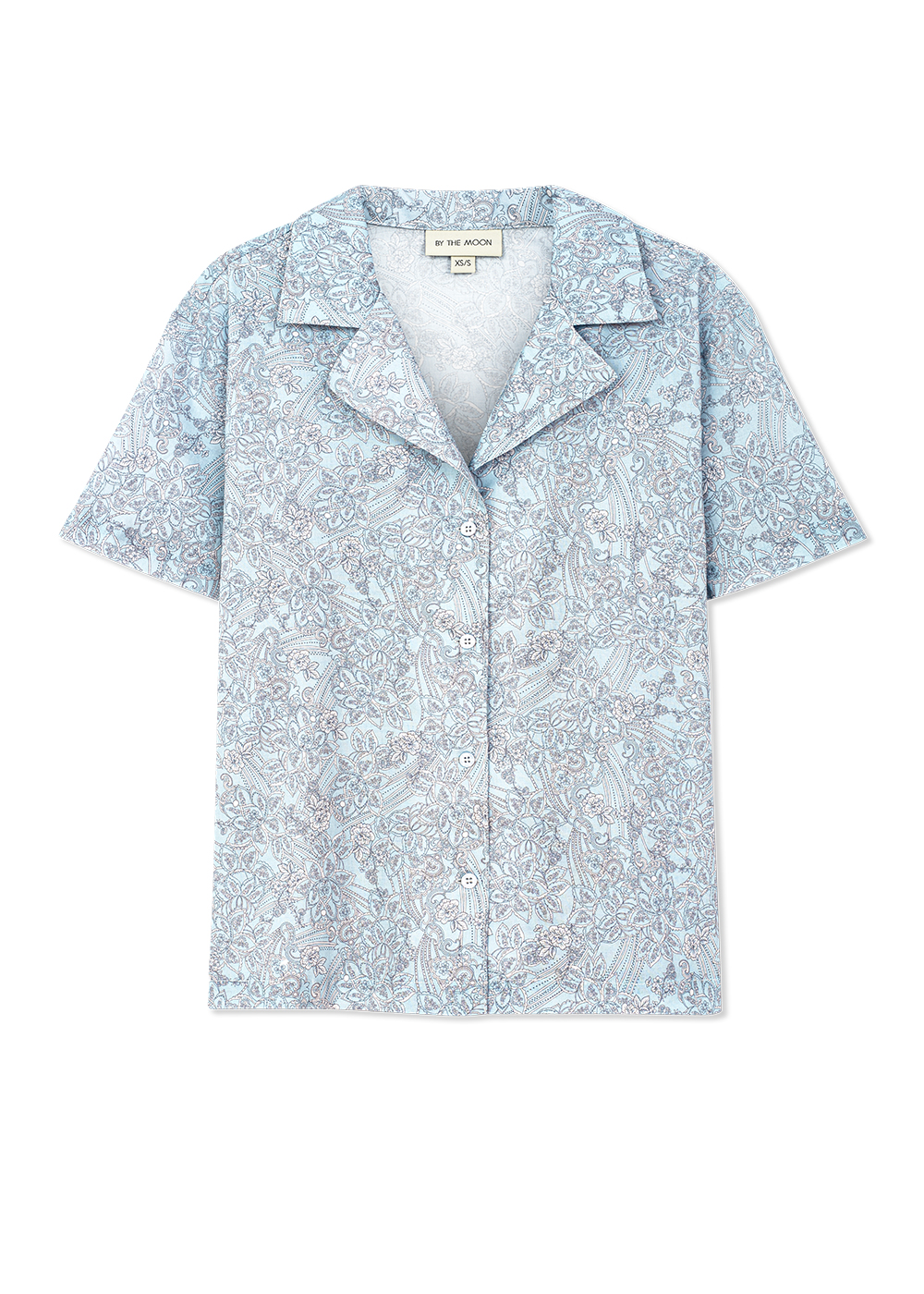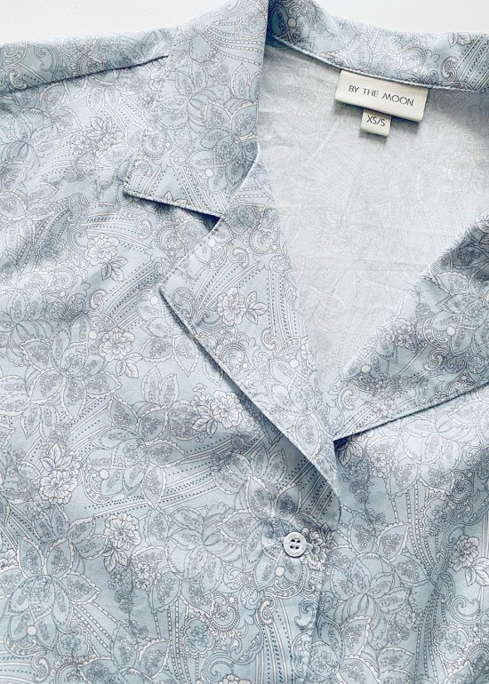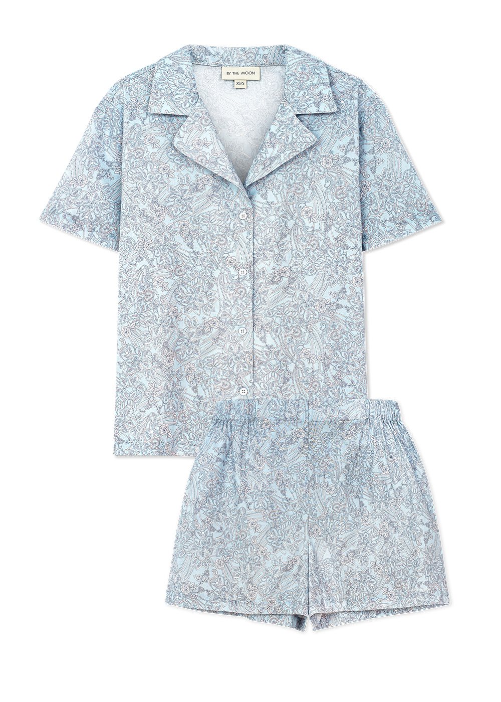 Damska piżama dwuczęściowa na noc i na leniwe, długie poranki z kawą. Luźna koszulka zapiana na guziki i wygodne spodenki zapakowane w elegancki woreczek to super kobieca piżama, swobodny homewear i idealny podróżny set w jednym. Piżama uszyta jest z 100% bawełny, z ponadczasowym, klasycznym motywem Paisley. Dostępna jest w dwóch wersjach kolorystycznych – błękitnej i jasno-różowej. Zrób sobie przyjemność, ten uroczy zestaw pięknie uzupełni Twoją nocną garderobę. To również doskonały pomysł na prezent dla bliskiej osoby.