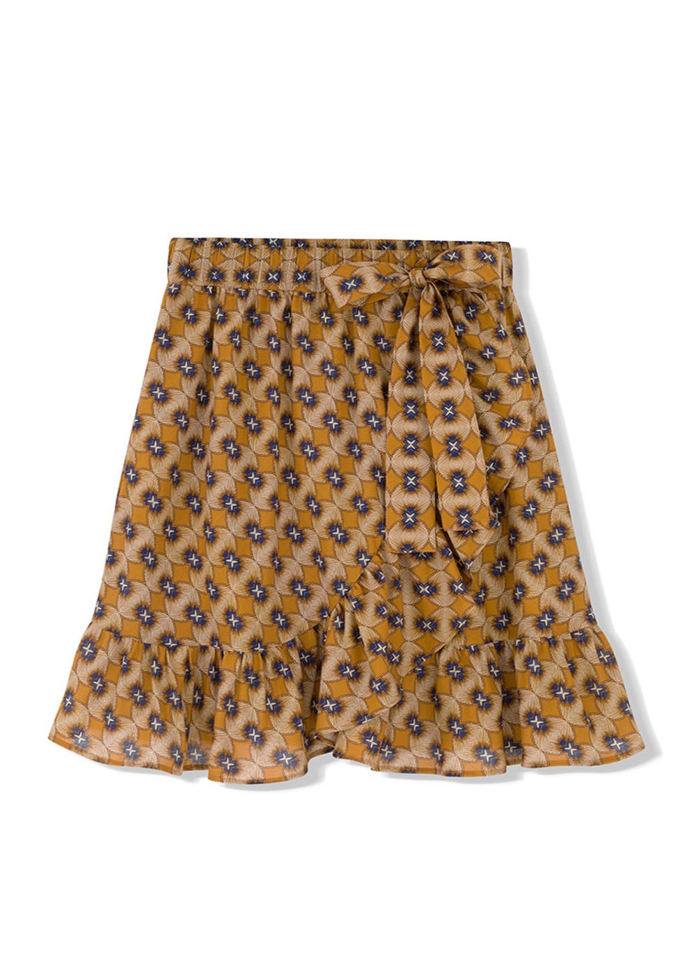 Damska, krótka spódnica uszyta z wzorzystego karmelowego materiału z drobnym, granatowym akcentem. Asymetryczny krój, imitujący kopertowy styl, wykończony kokardą w pasie i delikatnymi falbankami, nadaje lekkości całej stylizacji. Długość przed kolana, guma w pasie.
