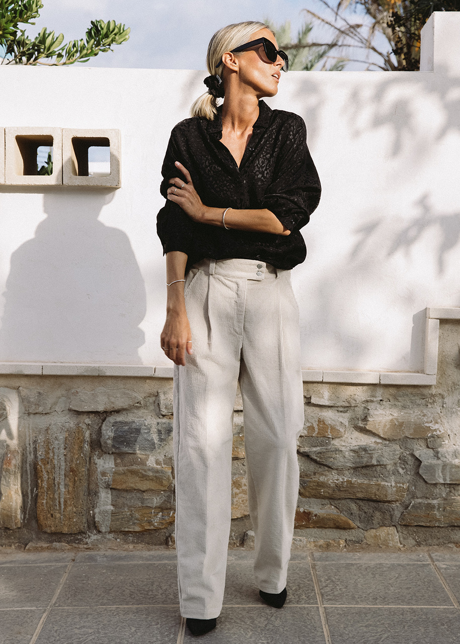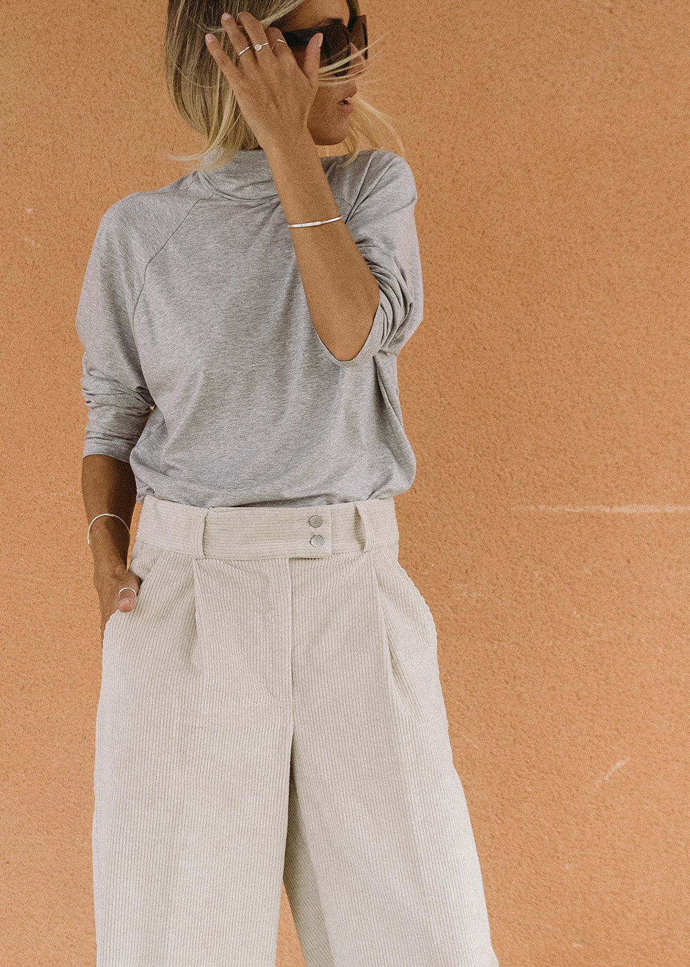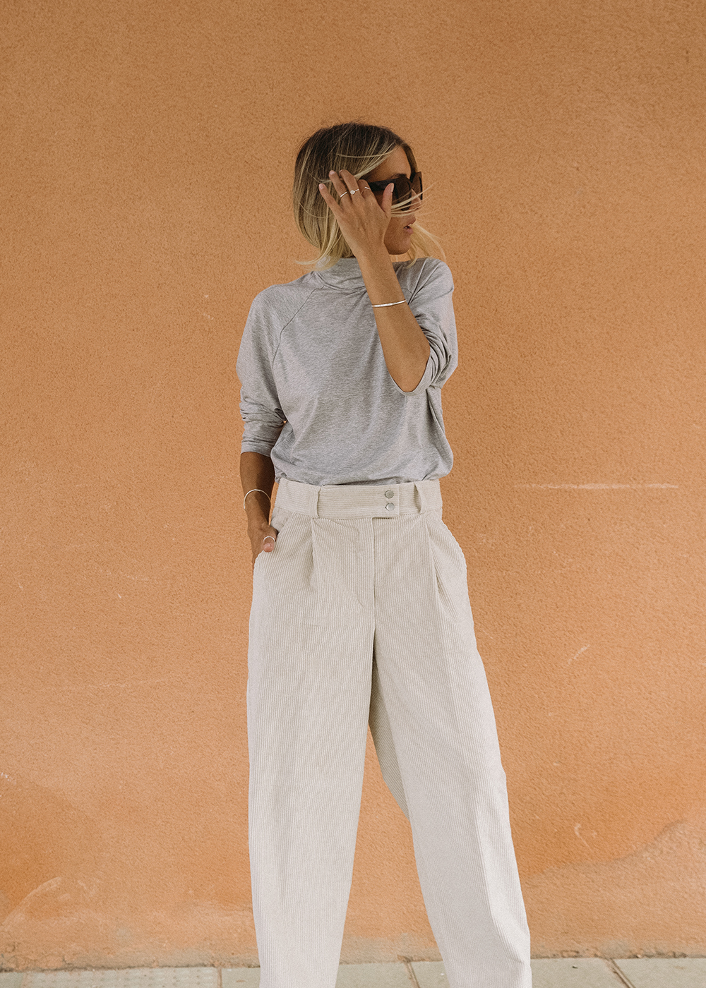 Damskie spodnie uszyte z miękkiego sztruksu, o luźnym kroju. Zapinane na suwak i dwa nabijane metalowe guziki, z tyłu wszyta jest guma, dzięki której spodnie dobrze się dopasowują do różnych sylwetek. Z przodu i z tyłu posiadają kieszenie. Dostępne są w pięknym kolorze kremowym, lawendowym i niebieskim. Nasz bawełniany sztruks z domieszką elastanu jest miękki i miły w dotyku oraz elastyczny, przez co spodnie zachowują swoją formę podczas noszenia. Miękkie i miłe w dotyku sztruksy są idealną bazą do łączenia z różnymi górami. Połącz z naszymi longsleevami czy kolorowymi bluzami! Must-have w Twojej szafie!