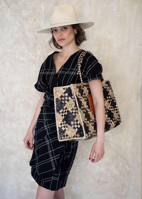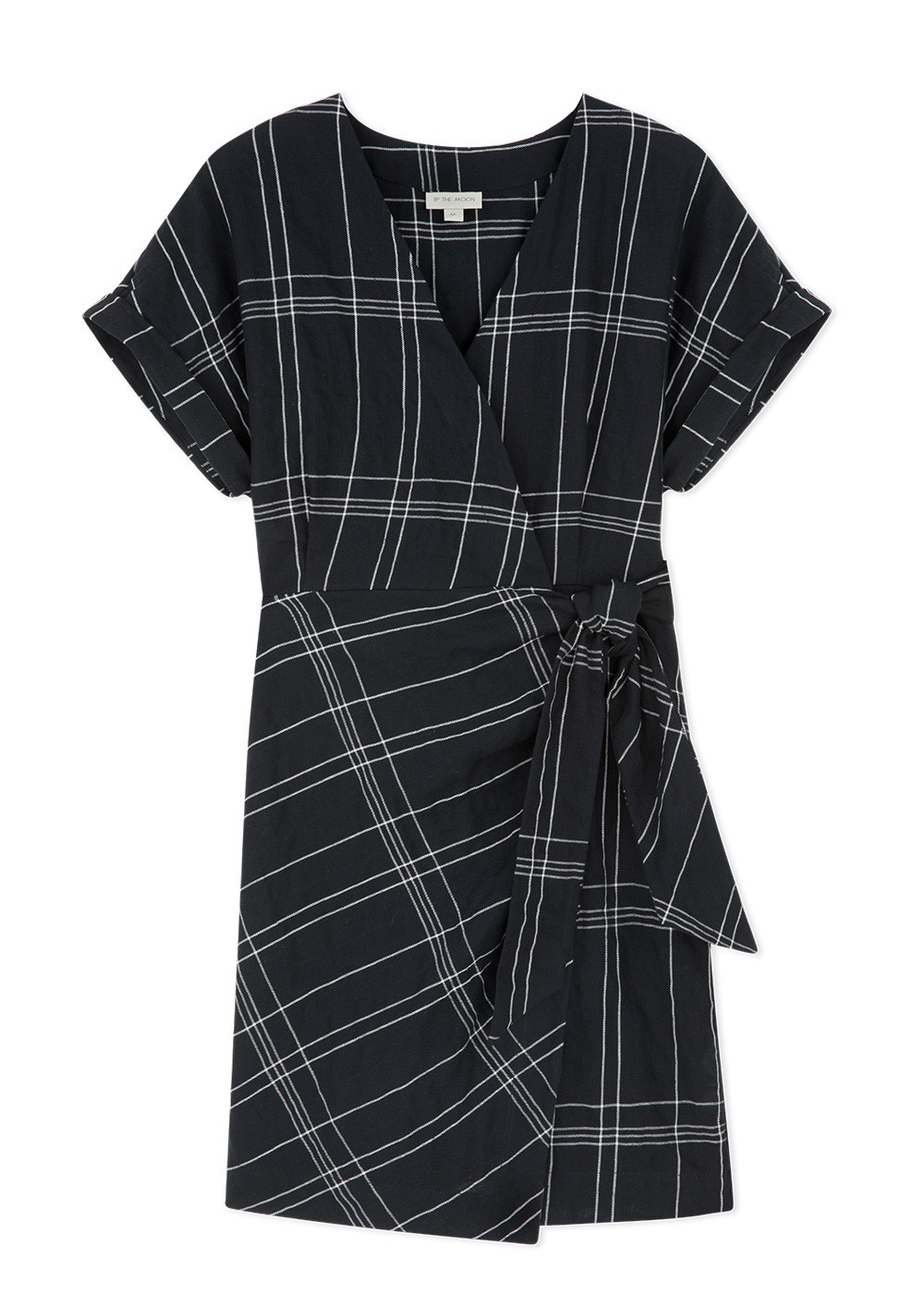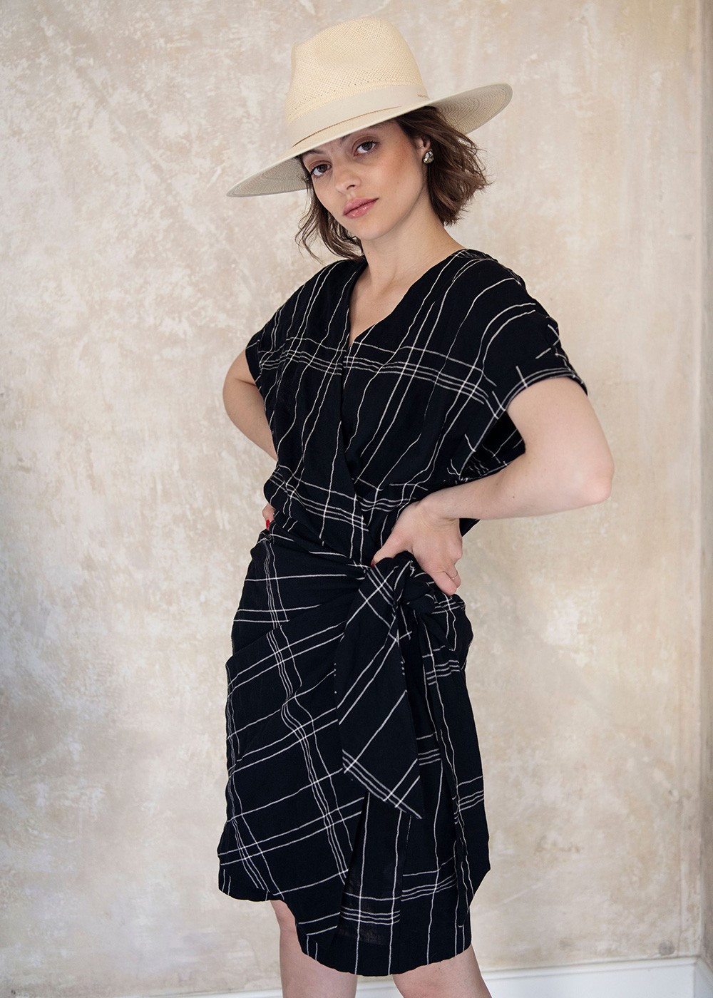 Bawełniana, damska sukienka o kopertowym kroju. Uszyta z lekko gniecionej czarnej tkaniny w nieregularną kratkę. Wiązanie w pasie podkreśla sylwetkę, daje możliwość regulacji i dobrze skrywa ewentualne “niedoskonałości” 😉 Krótki, szeroki rękaw. Rozcięcie z przodu dodaje seksapilu.