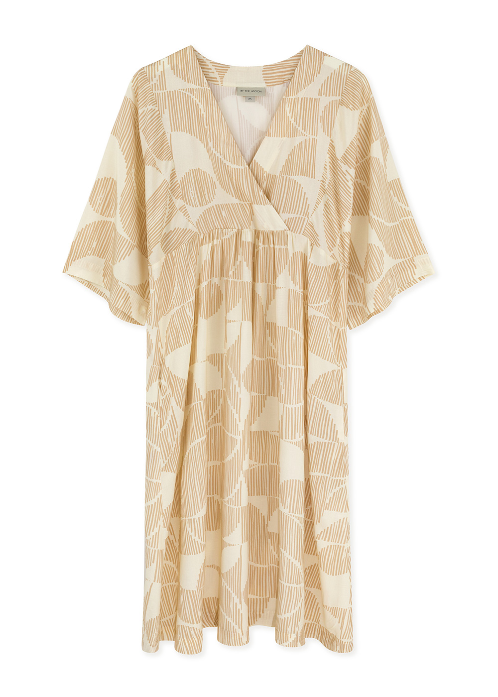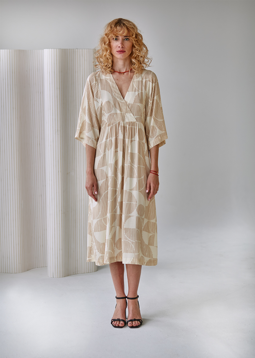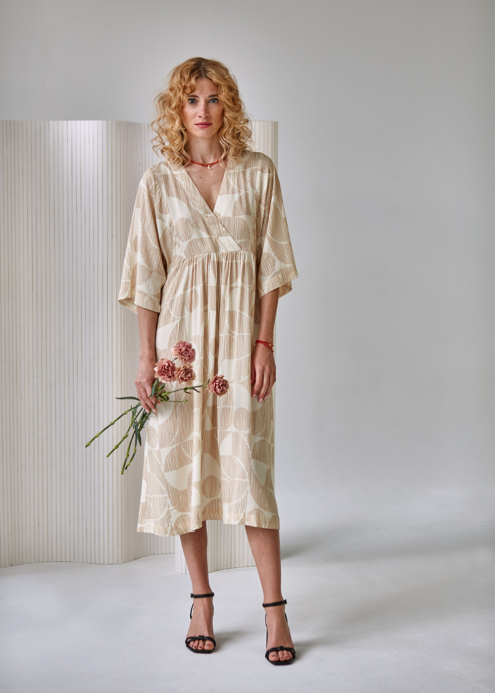 Delicate feminine dress with kimono sleeves and V-shaped neckline. Beautiful, geometric yet delicate print gives it an original look. Very comfortable and easy to wear. With side pockets. It can make a beautiful style for many occasions – from weddings to a beach walk.