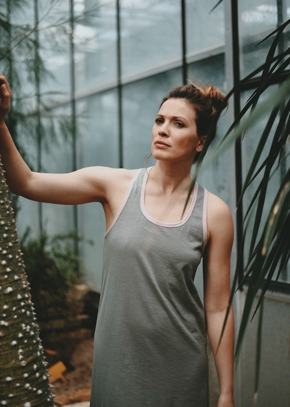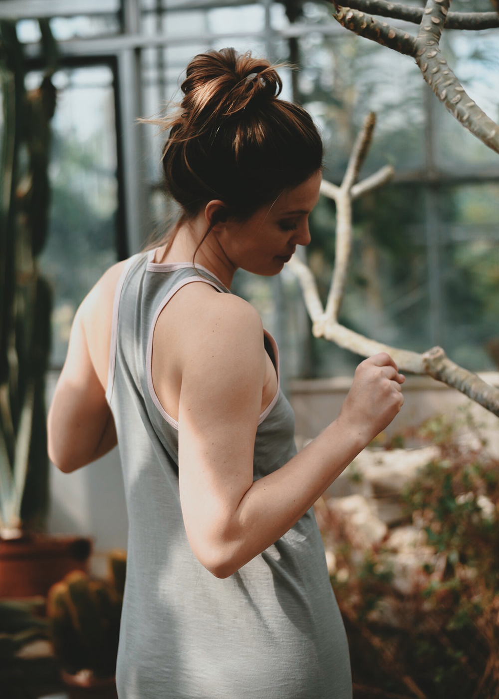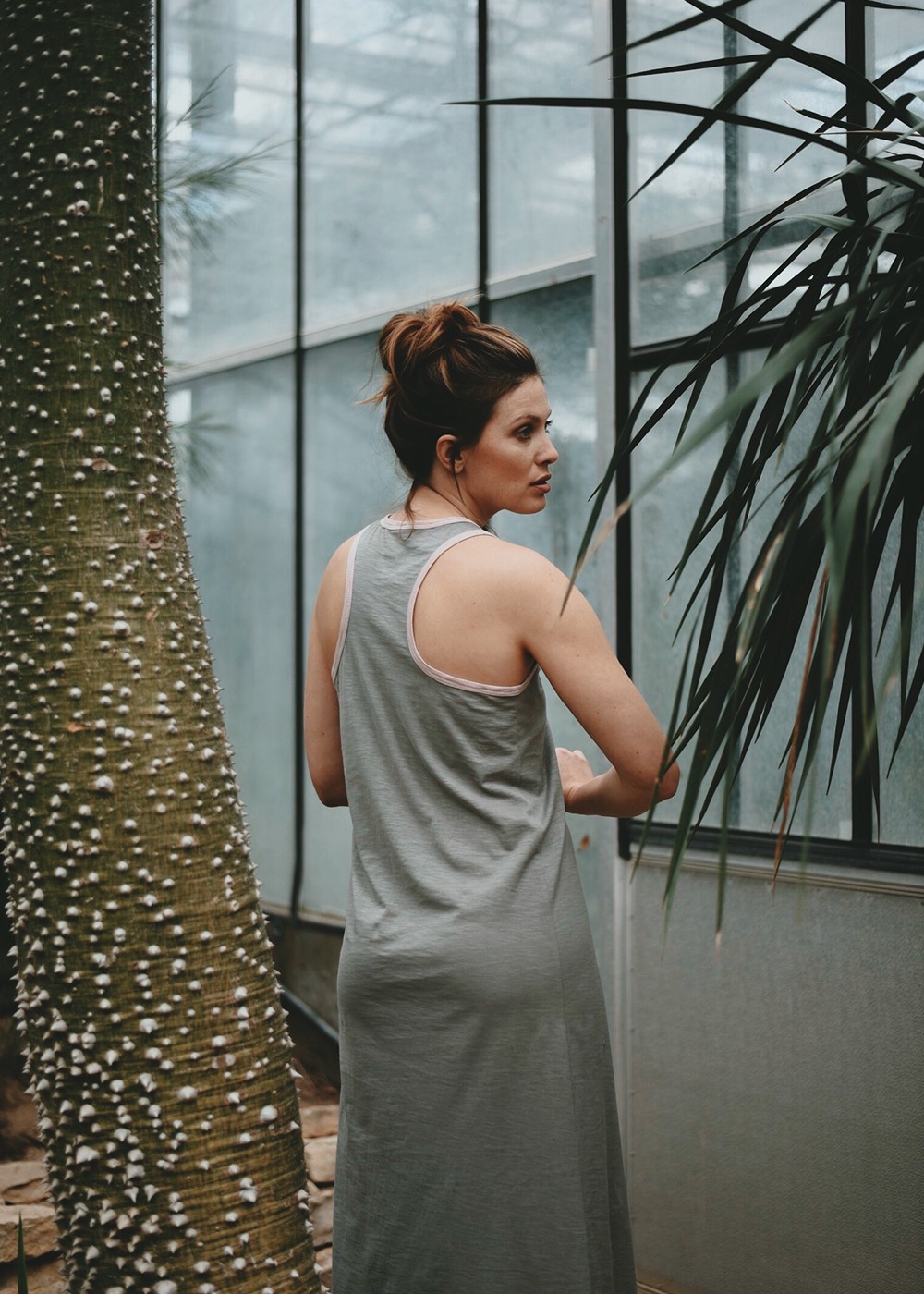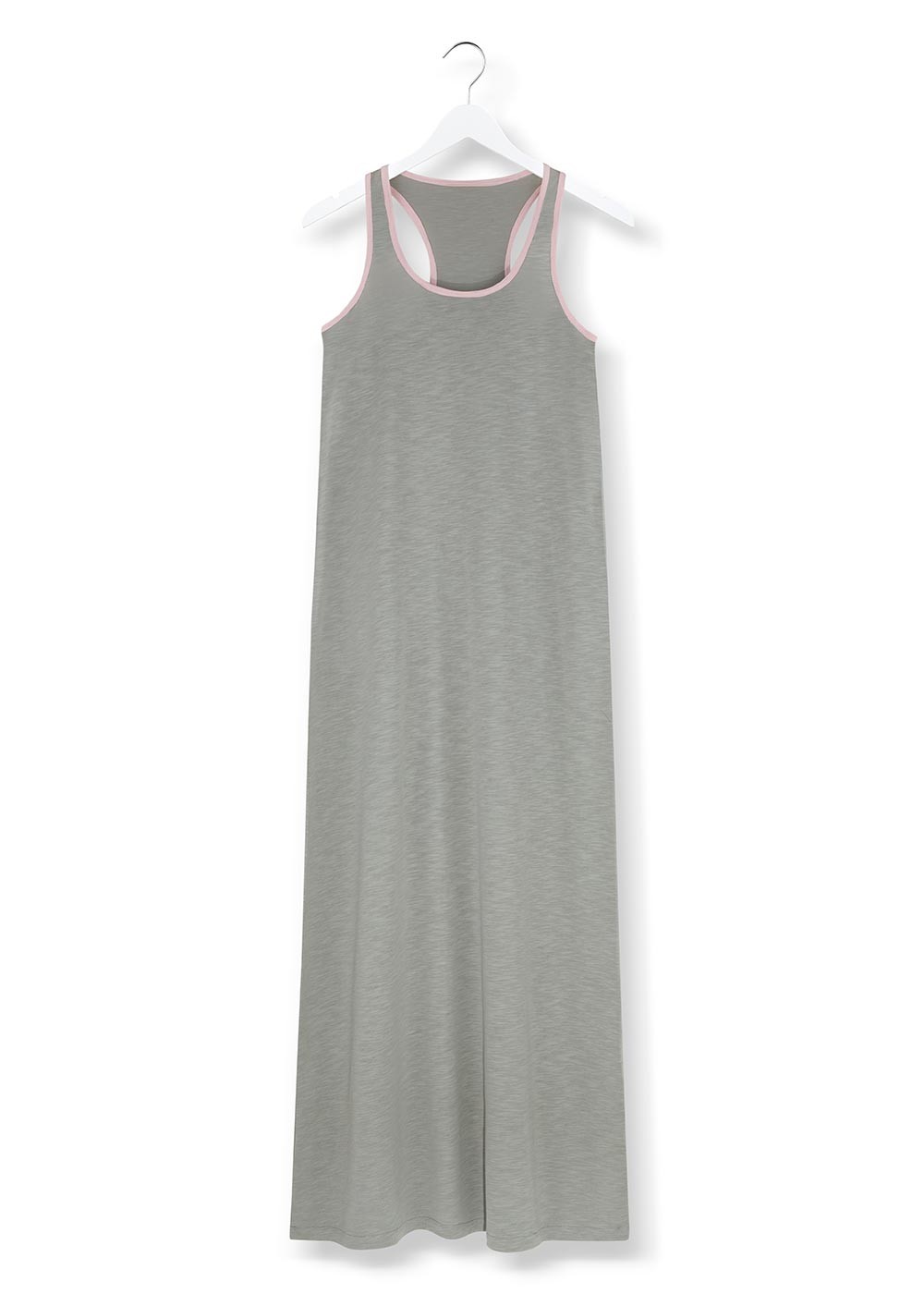 Damska długa sukienka z miękkiej, lejącej się dzianiny bawełnianej. Krój tank-topowy, na ramiączkach, z kontrastową lamówką w kolorze pastelowego różu. Prosty, sportowy krój, długość za łydkę/ przed kostkę. Idealna na upalne dni.