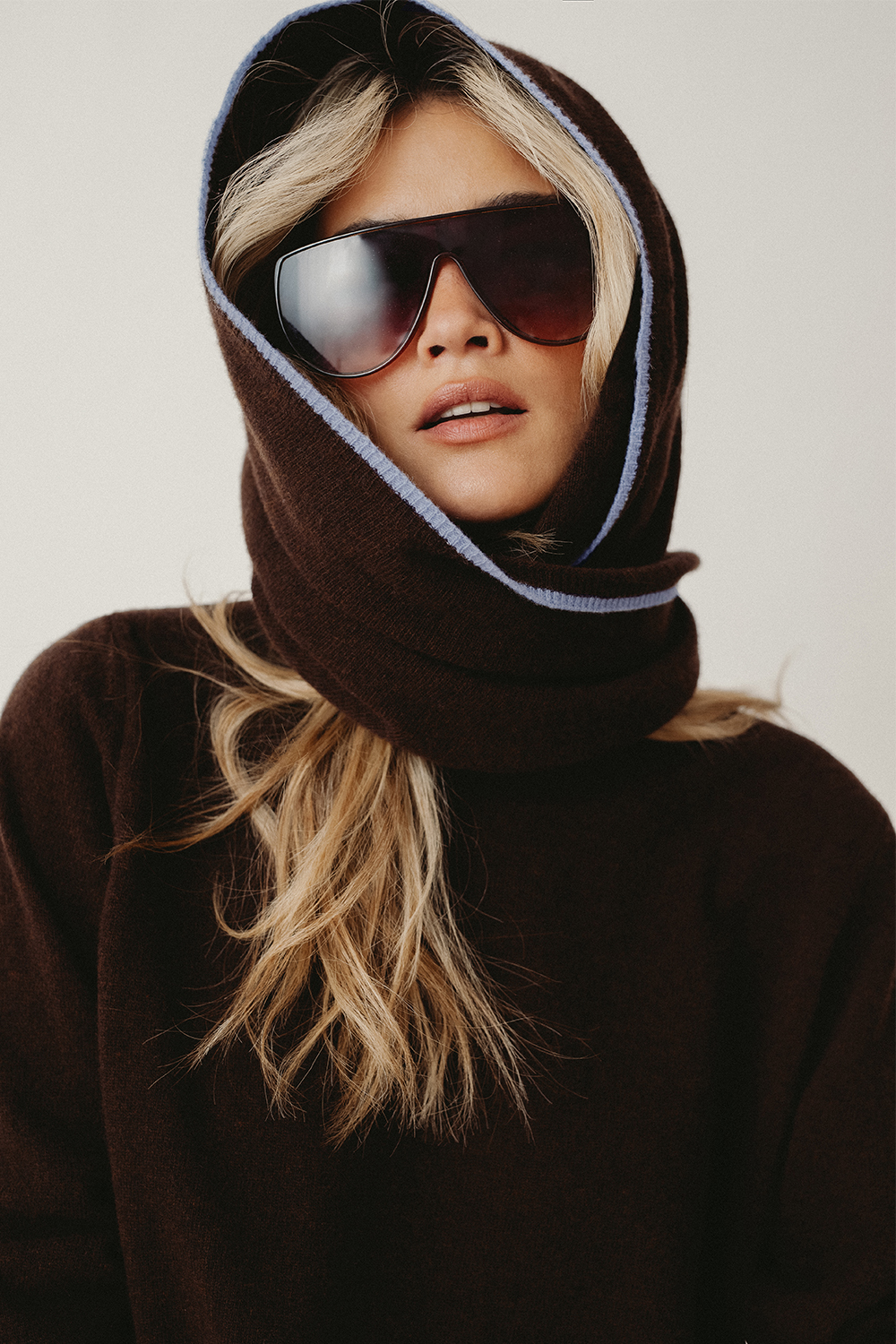 Damski sweter Noemi dark choco wykonany z miękkiej, szlachetnej wełny merino extra fine, w głębokim, czekoladowym odcieniu. Kontrastowe, subtelne wykończenia w kolorze błękitu dodają mu nowoczesnego charakteru, a klasyczna forma z okrągłym dekoltem sprawia, że świetnie odnajdzie się w miejskim looku – od spotkań przy kawie, po popołudniowe spacery po mieście. Pięknie wygląda w zestawie z chustą dark choco w tym samym kolorze, tworząc elegancki, monochromatyczny look. Doskonale łączy się także z naszymi czekoladowymi kulotami, spódnicami czy garniturowymi spodniami – razem tworzą stylizacje, które są jednocześnie komfortowe i wyjątkowo szykowne. Zrobiony z włoskiej przędzy 100% merino, która zapewnia ciepło i komfort. Idealny na każdą porę roku.