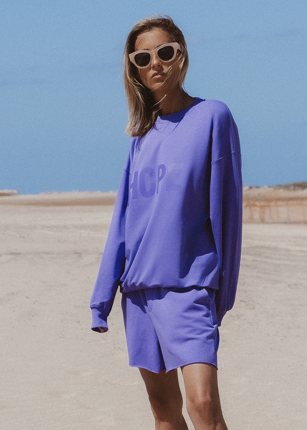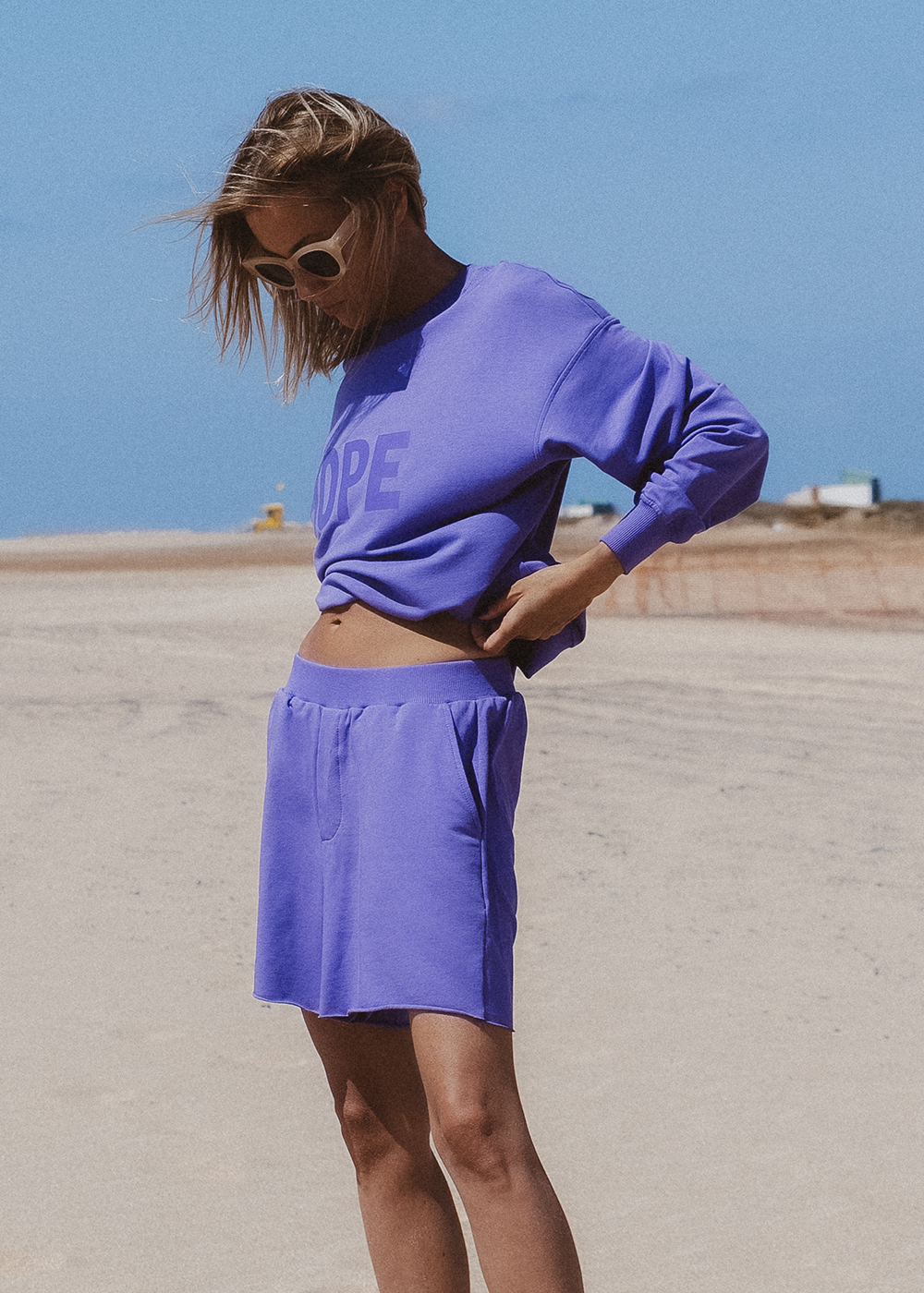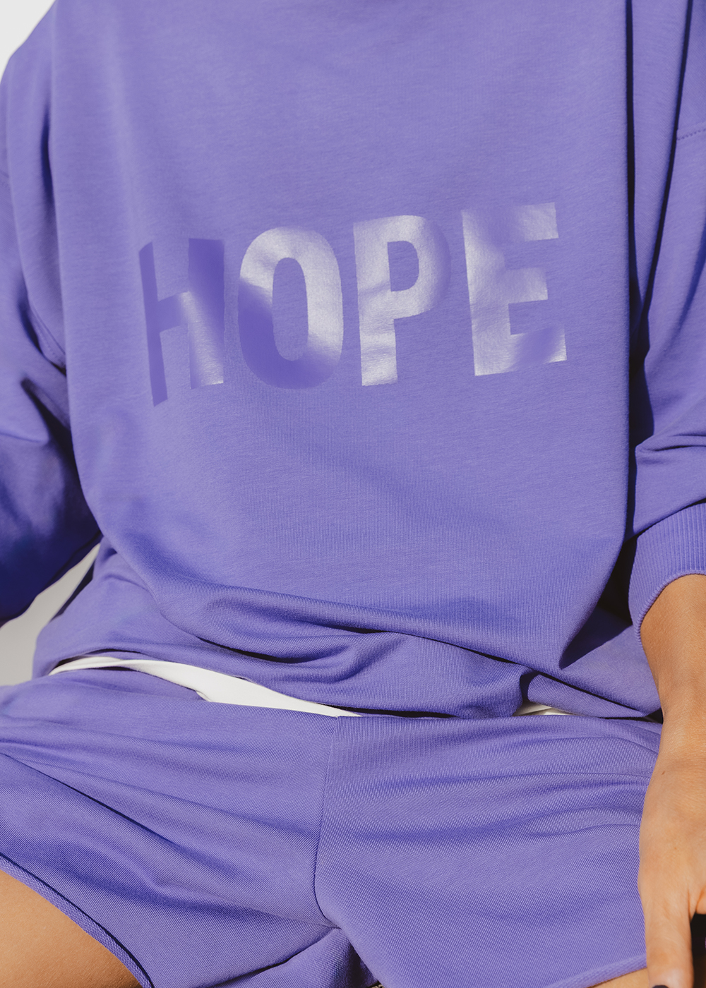 Wygodne szorty w intensywnym odcieniu fioletu – idealne do bluzy HOPE, razem tworzą zestaw pełen dobrej energii. Surowe wykończenie nogawek dodaje im luzu, a imitacja rozporka z przodu nadaje lekko męski, casualowy charakter. Uszyte z lekkiej, dzianiny pętelkowej – miękkie, swobodne i bardzo komfortowe. Elastyczny pas i luźny krój sprawiają, że nosi się je z przyjemnością, niezależnie od planu na dzień. Noś je solo albo w komplecie z bluzą HOPE.
