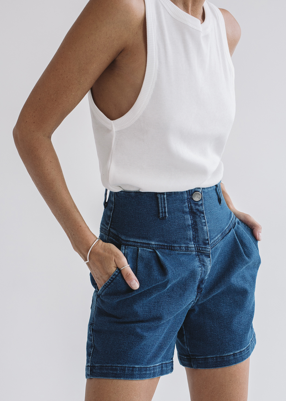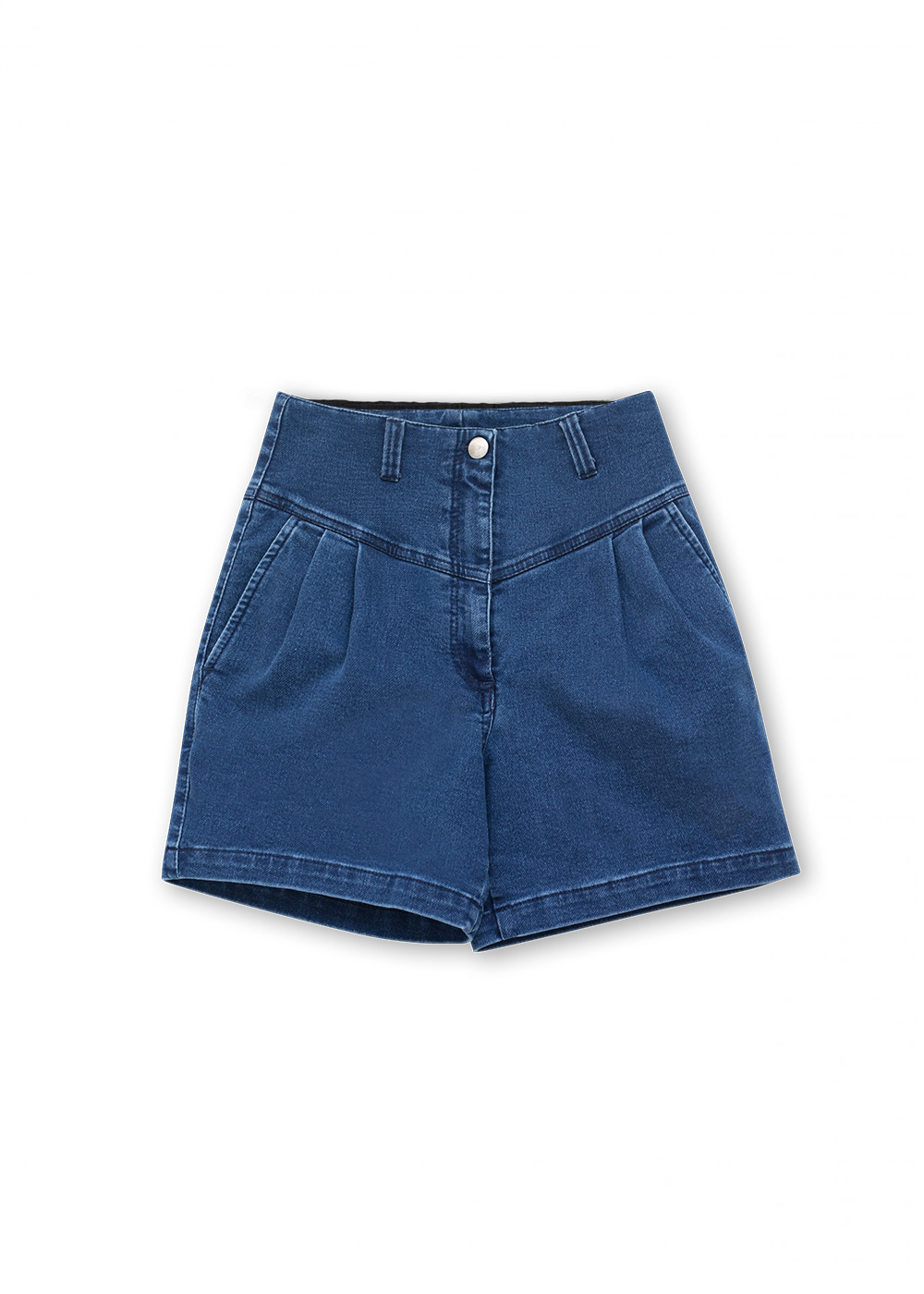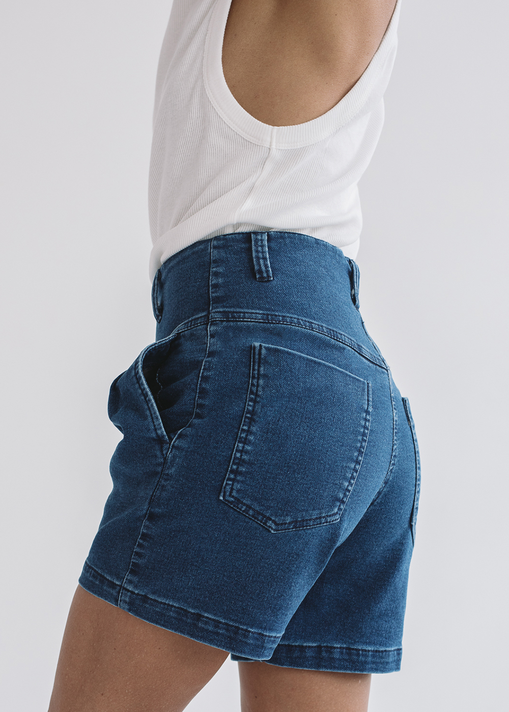 Ultra kobiece, krótkie szorty z elastycznego, spranego denimu w klasycznym niebieskim kolorze. Szeroki karczek i wysoki stan pięknie podkreślają i wysmuklają sylwetkę. Zapinane na suwak i metalowy guzik, z kieszeniami na bokach i z tyłu. Na przodzie znajdują się zakładki dodające kobiecości i elegancji. Spodenki można wywinąć tworząc swobodny, plażowy look lub nosić nieco dłuższe. Elastyczna tkanina dobrze dopasowuje się do ciała, zapewniając komfort noszenia i nie opinając zbytnio sylwetki.