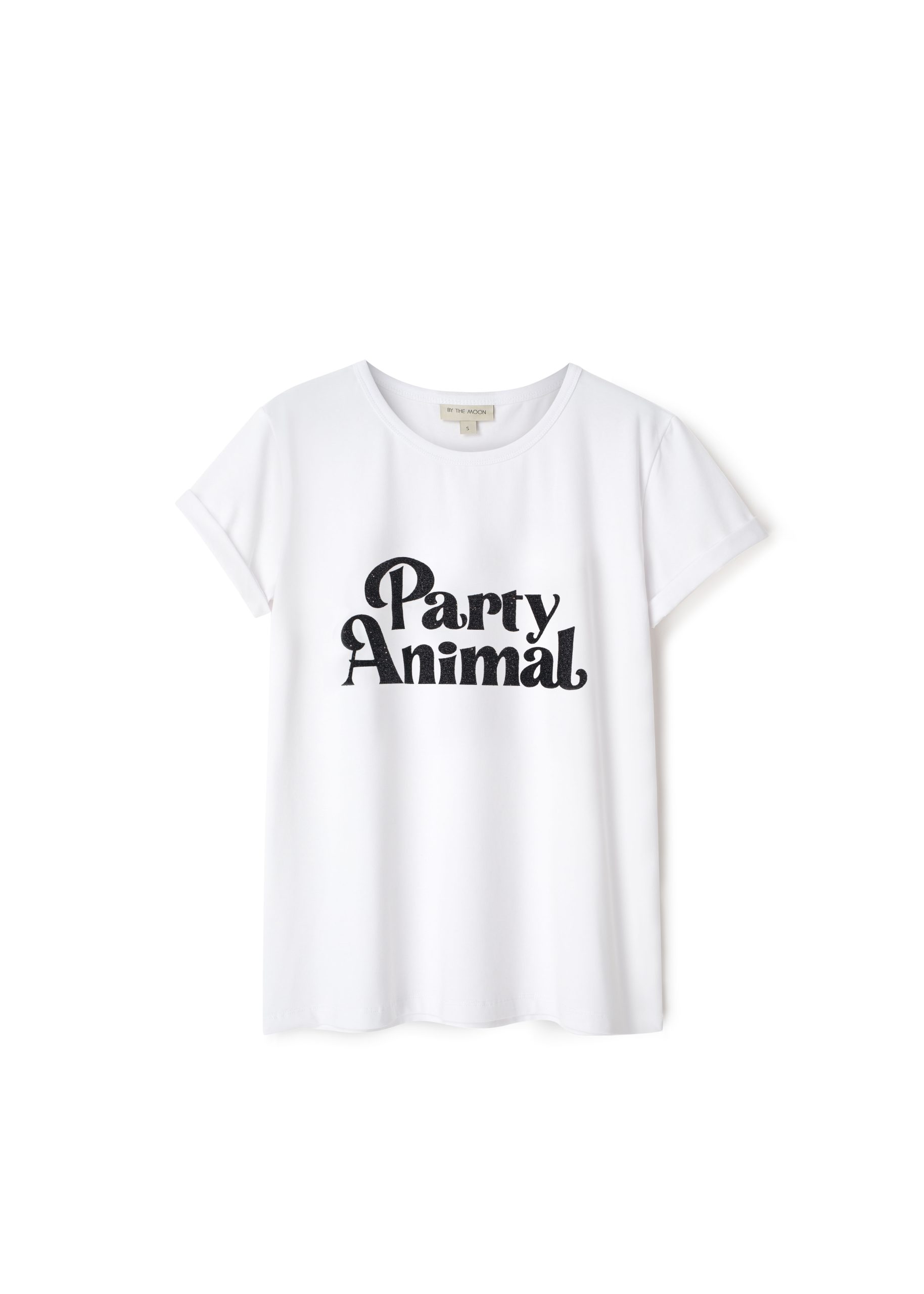 Biały t-shirt z połyskującym brokatowym napisem Party Animal. Dla tych z Was, które lubią dobrą zabawę.  Klasyk, który idealnie sprawdza się na imprezę. W połączeniu z błyszczącą mini Mila silver, jeansami czy czarnym garniturem tworzy wieczorową niezobowiązującą stylizację, na luzie, z poczuciem humoru. Bawcie się dobrze!