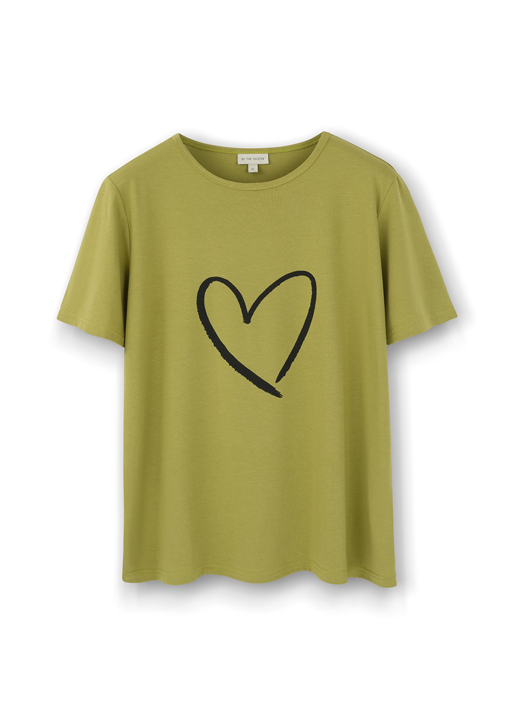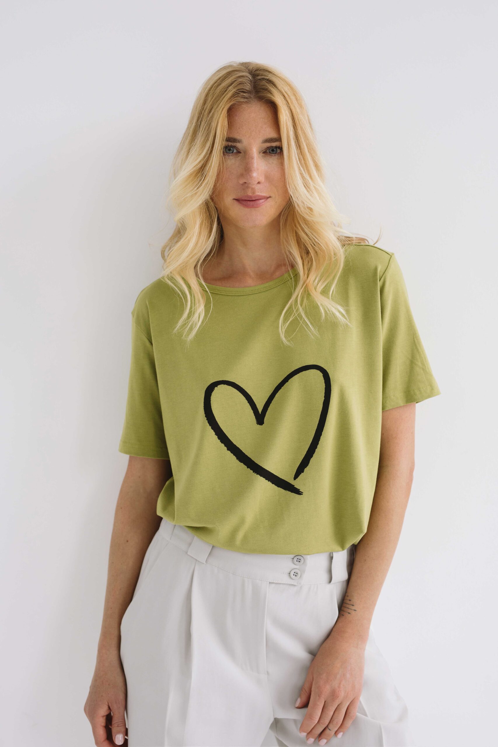 Damska koszulka z krótkim rękawem uszyta z niezwykle miękkiej w dotyku i lejącej się dzianiny bambusowej z dodatkiem bawełny i elastanu. W pięknym oliwkowym kolorze, z przodu nadrukowane czarne serce – jakby maźnięte farbą. Świetna baza do dalszych stylizacji. Cudownie wygląda z naszymi szerokimi spodniami Colette orchidea.