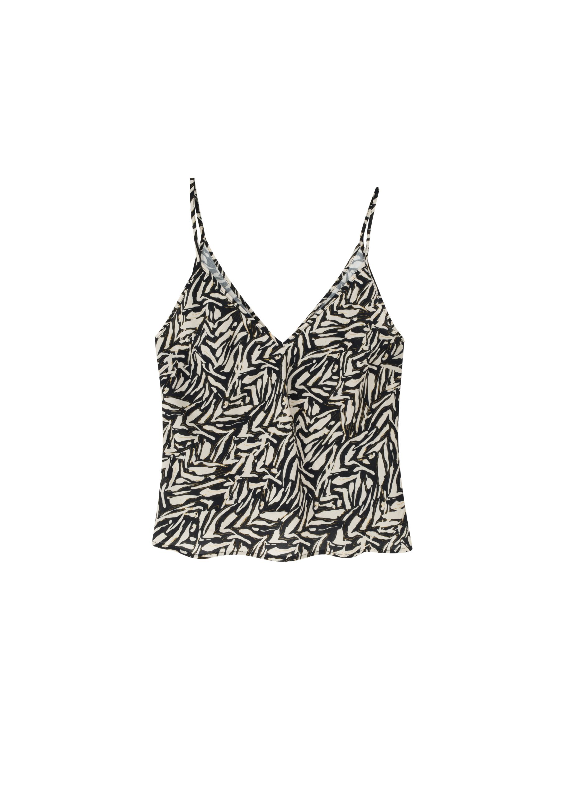 Mini top na cienkich ramiączkach z głębokim dekoltem w kształcie V, zarówno z przodu jak i na plecach. Stworzony z myślą o upalnych letnich dniach. Top ładnie eksponuje dekolt, plecy i ramiona, można go nosić bez lub z biustonoszem na cienkich paskach. Idealnie sprawdzi się w letnich podróżach. Można łączyć go ze spódnicą z tym samym printem, tworząc zestaw niczym sukienka, lub z szortami i spodniami.
