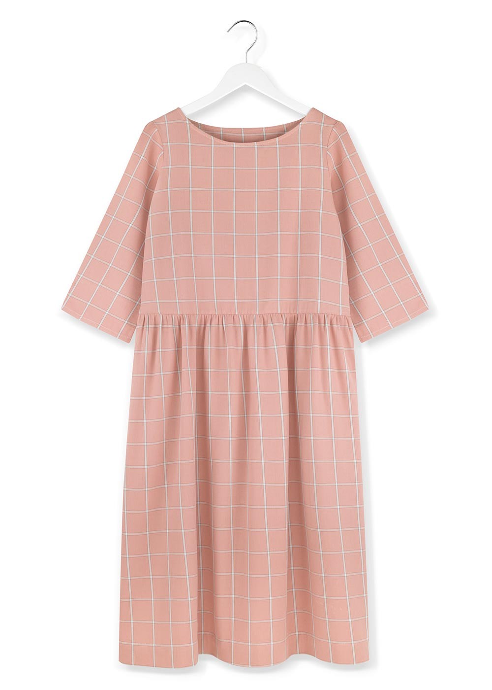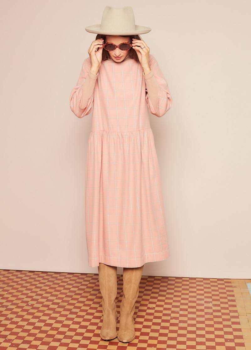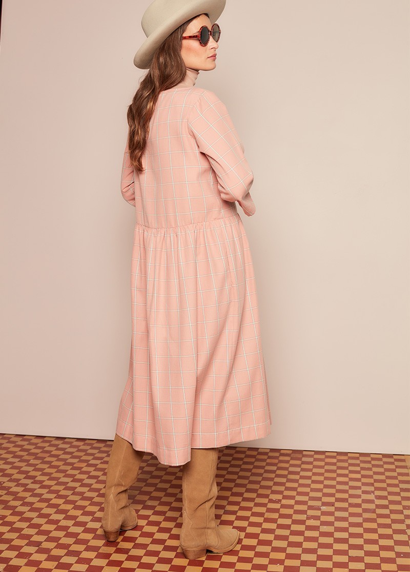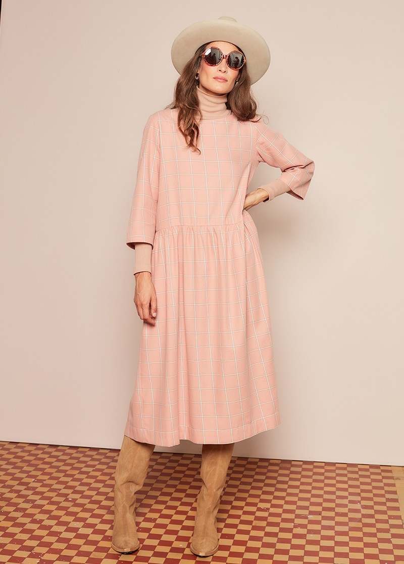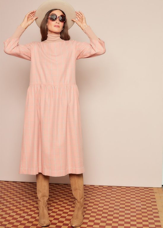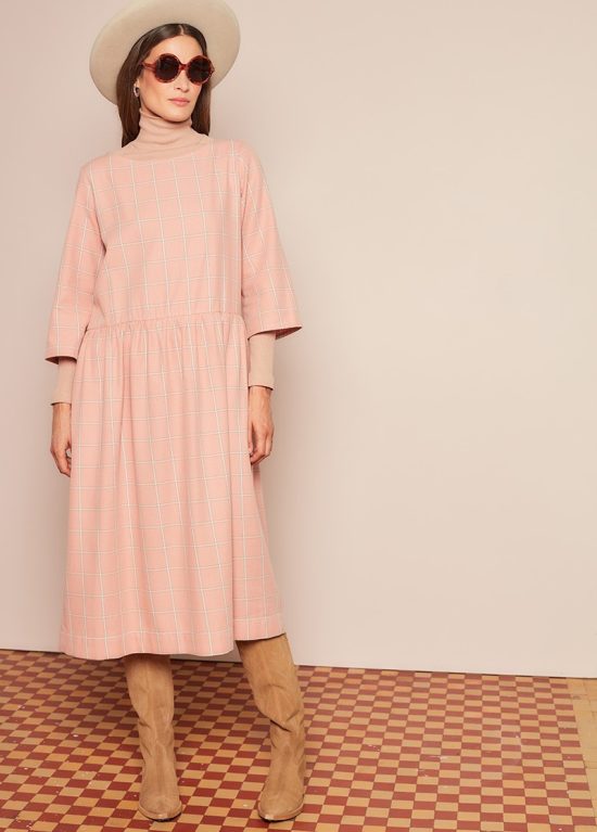 Długa, luźna sukienka z miękkiej flaneli, w pięknym kolorze pudrowego różu. Delikatna pastelowa kratka. rękawy 3/4