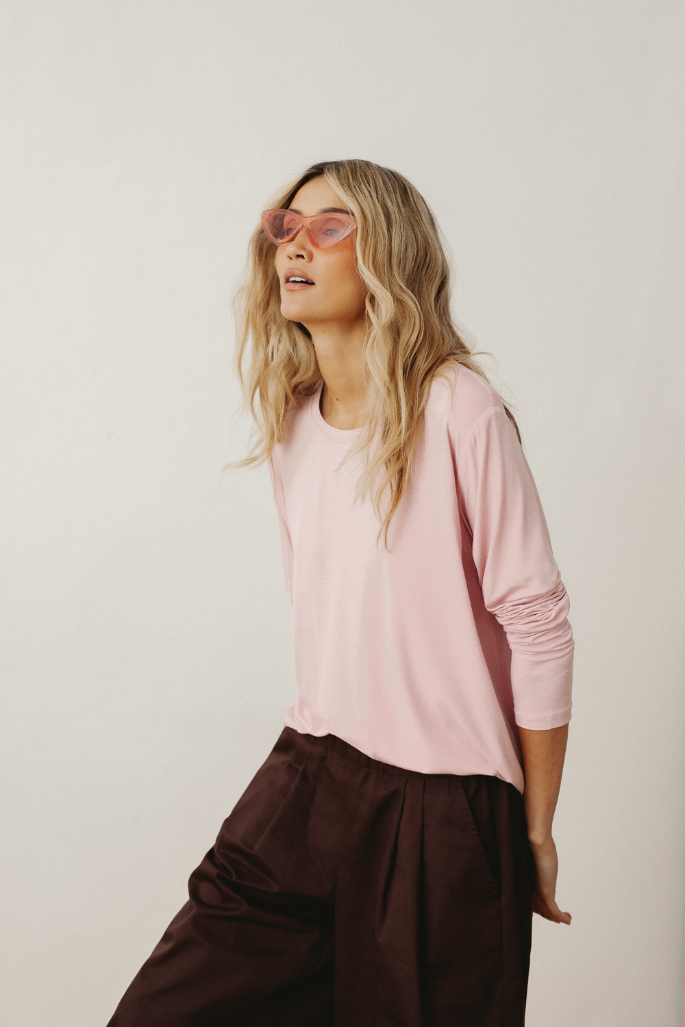 Klasyczny, damski longsleeve z okrągłym dekoltem, w odcieniu pudrowego rózu. Delikatny i kobiecy kolor rose pięknie rozświetla skórę i nadaje romantycznego looku. Subtelny jak róż na policzkach. Długie rękawy i prosta forma to świetna baza do różnych zestawów. Miękka i lejąca się dzianina ciro viscose otula skórę niczym druga, niewyczuwalna warstwa. Świetnie wygląda z jeansami, garniturowymi spodniami, czy zwiewnymi spódnicami. Nada lekkości jesiennym stylizacjom. Bluzka uszyta z dzianiny z certyfikatem OEKO-Tex Standard 100.