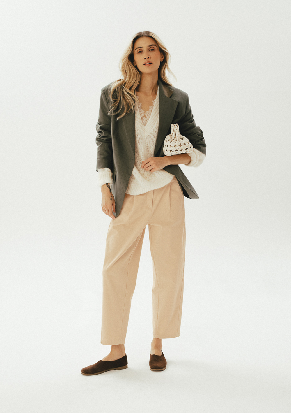 Spodnie damskie w odcieniu ciepłego beżu, inspirowane klasycznym krojem chinosów. Mają luźną, wygodną formę, zwężaną nogawkę o długości nad kostkę, która nadaje sylwetce lekkości i nowoczesnego charakteru. Wyróżnia je dodatkowy szew poprowadzony wzdłuż boku nogawki. Model zapinany na suwak, z klasycznym pasem, karczkiem z tyłu i kieszeniami. Wykonane są z wyjątkowo przyjemnej w dotyku tkaniny bawełnianej z efektem peach – z delikatnym, miękkim meszkiem. Świetne jako basic, idealne na co dzień, zarówno do sportowych topów, jak i do klasycznych koszul, bluz czy obszernych swetrów. Justine – nazwa, która subtelnie nawiązuje do „just” – po prostu, naturalnie, po swojemu. Dokładnie tak, jak chcemy je nosić.