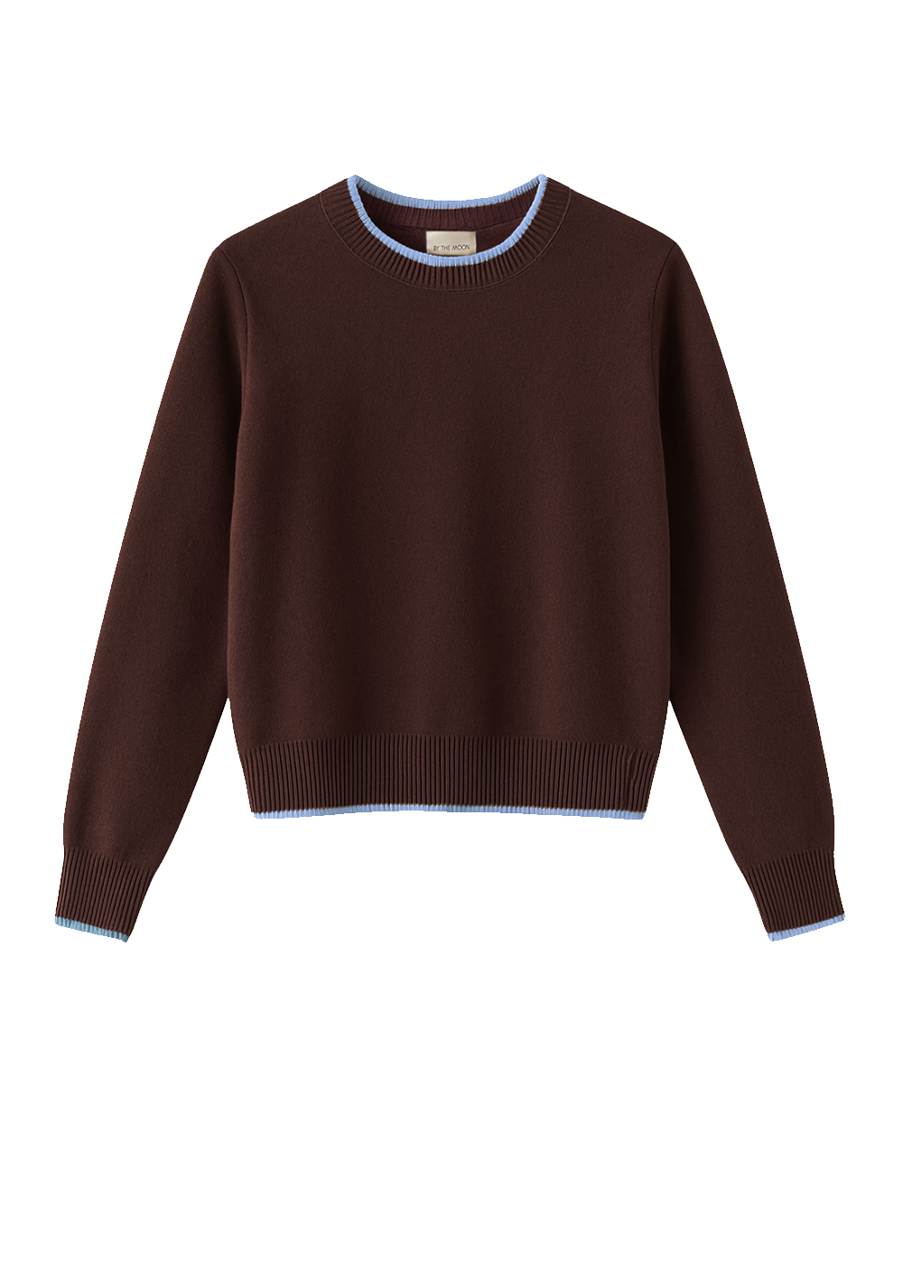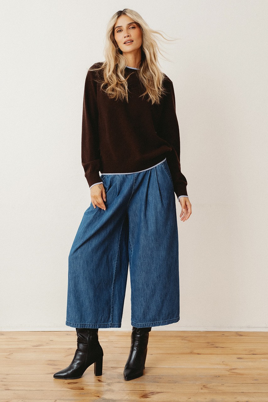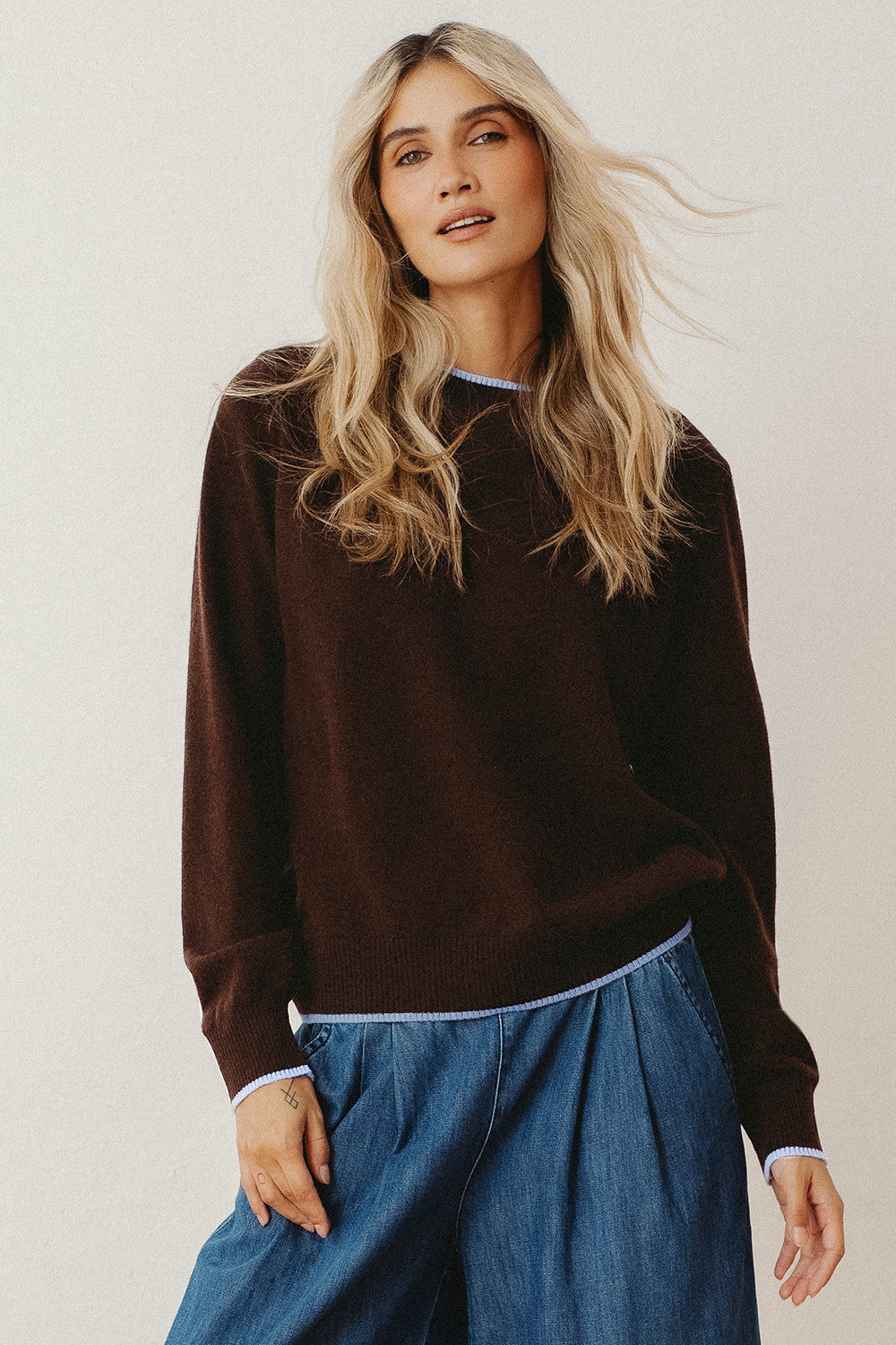 Damski sweter Noemi dark choco wykonany z miękkiej, szlachetnej wełny merino extra fine, w głębokim, czekoladowym odcieniu. Kontrastowe, subtelne wykończenia w kolorze błękitu dodają mu nowoczesnego charakteru, a klasyczna forma z okrągłym dekoltem sprawia, że świetnie odnajdzie się w miejskim looku – od spotkań przy kawie, po popołudniowe spacery po mieście. Pięknie wygląda w zestawie z chustą dark choco w tym samym kolorze, tworząc elegancki, monochromatyczny look. Doskonale łączy się także z naszymi czekoladowymi kulotami, spódnicami czy garniturowymi spodniami – razem tworzą stylizacje, które są jednocześnie komfortowe i wyjątkowo szykowne.