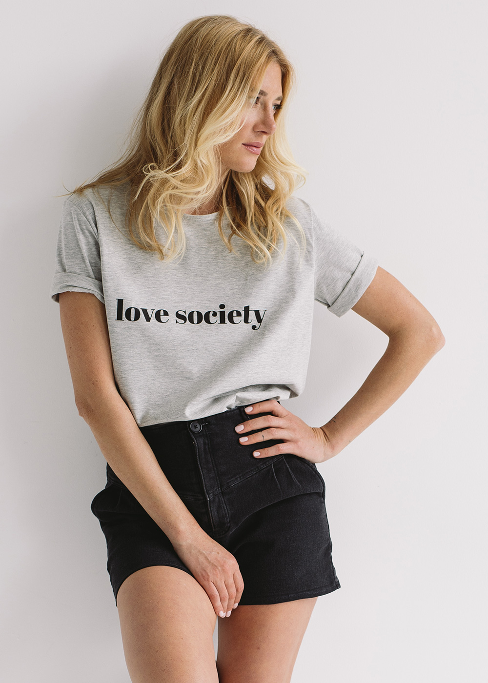Klasyczny, damski szary t-shirt, który pasuje do wszystkiego i jednocześnie podkreśla osobowość. Prosty, luźny krój, okrągły dekolt. Z przodu napis nadrukowany farbami wodnymi, przyjaznymi dla skóry – motto dla wszystkich tych, którzy kochają miłość. Uszyty z miękkiej, bawełnianej melanżowej dzianiny z dodatkiem elastanu, który umożliwia lepszą pielęgnację koszulki. Można nosić z podwiniętymi rękawkami.