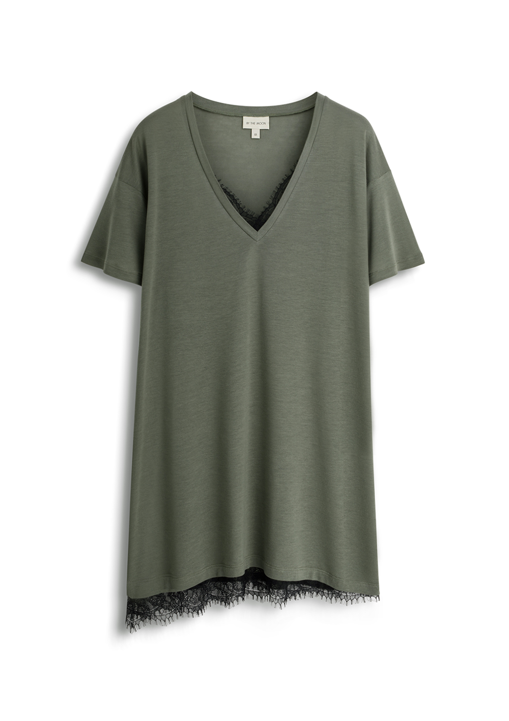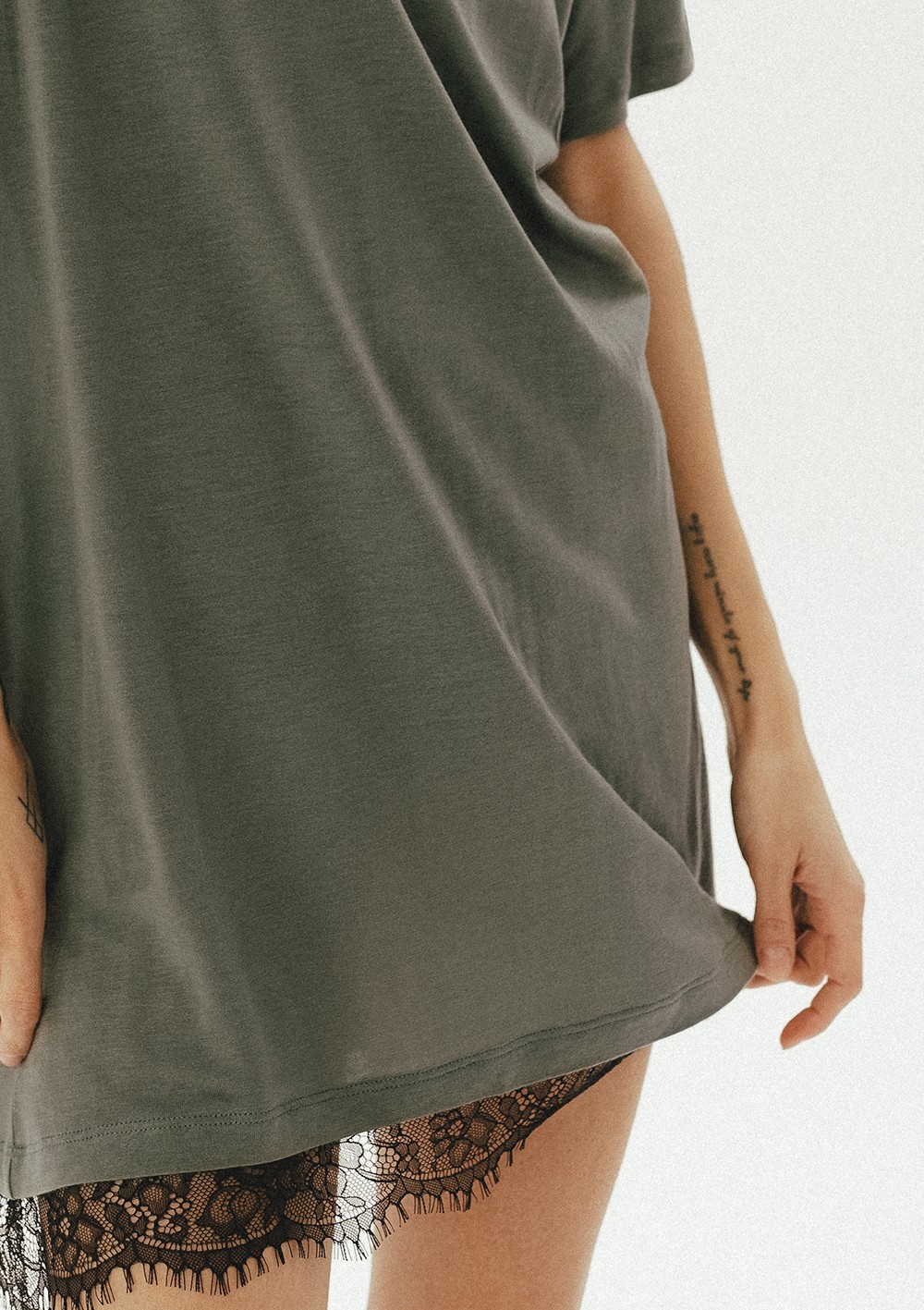 Tunika w formie T-shirtowej krótkiej sukienki w kolorze khaki. Łączy swobodną, miękką formę z zadziornym, koronkowym wykończeniem. Delikatna koronka subtelnie wystaje spod linii materiału, jak bieliźniany detal, który dodaje tunice charakteru i lekko prowokacyjnej kobiecości. Luźny krój pozwala ją nosić na wiele sposobów. Nonszalancko zarzuconą na ciało, przewiązaną w talii albo jako mini sukienkę. Romantyczna z nutą vintage, a jednocześnie trochę rockowa. Idealna na dzień, kiedy chcesz czuć się swobodnie, i na wieczór, kiedy wystarczy dodać botki i biżuterię, by zupełnie zmienić swój look. Koronkowy must-have tego sezonu;) Jedna sukienka do wielu różnych warstwowych stylizacji.